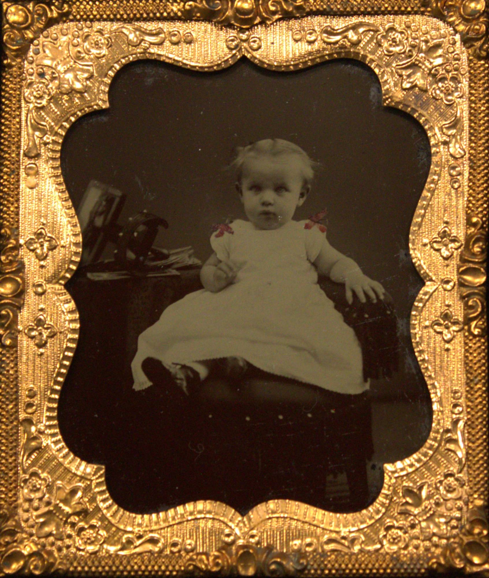 1/6 plate tintype depicting E. Allis Andrews, who was born October 23, 1870. A stereoscope sits on the table next to her and the ribbons on her dress are hand-colored pink. The leatherette case is inscribed and an albumen portrait of her father, Orlin Andrews, sits behind the tintype.