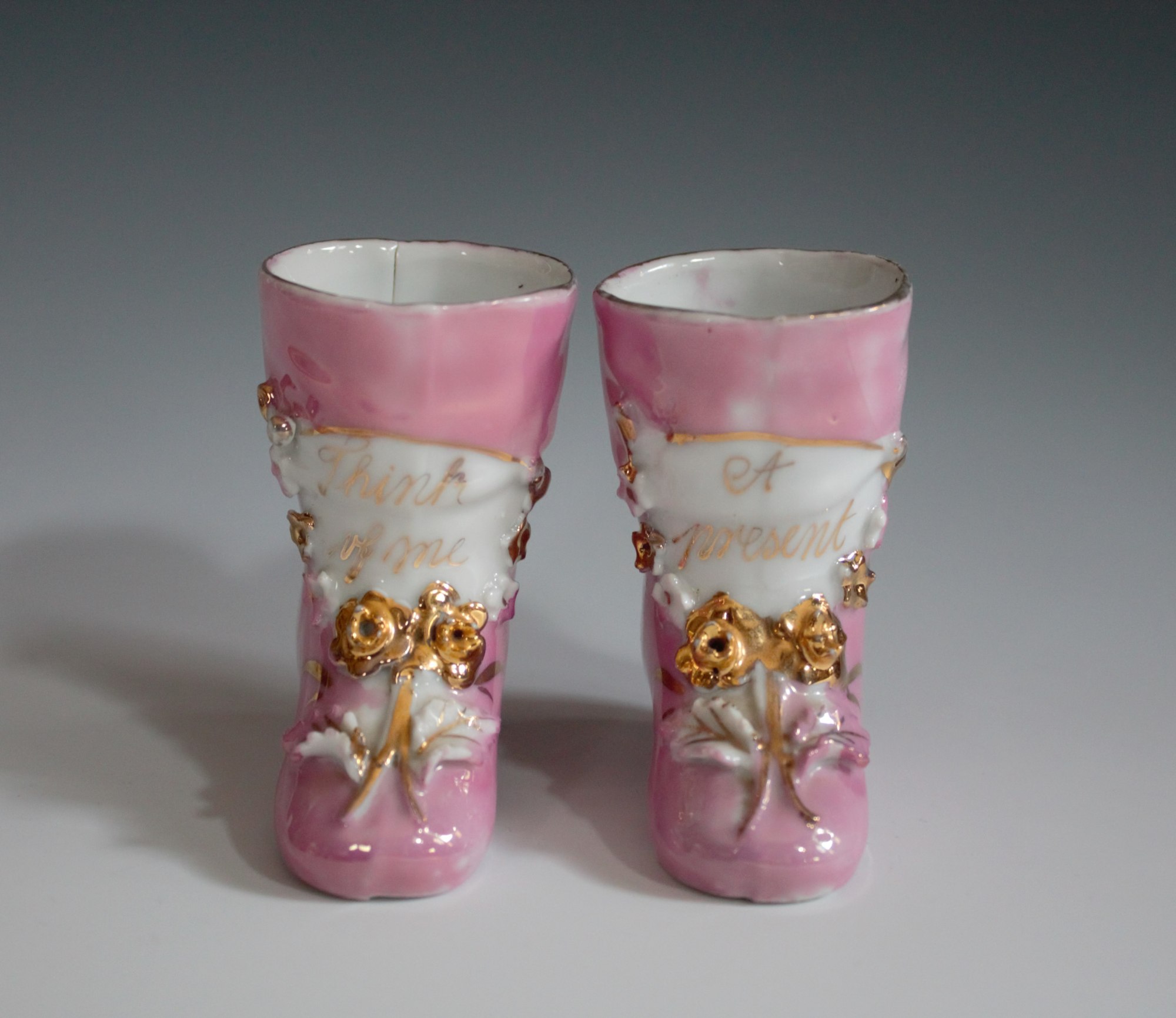 Pair of glazed and gilded boot-shaped toothpick holders with the phrases "A Present" and "Think of Me."