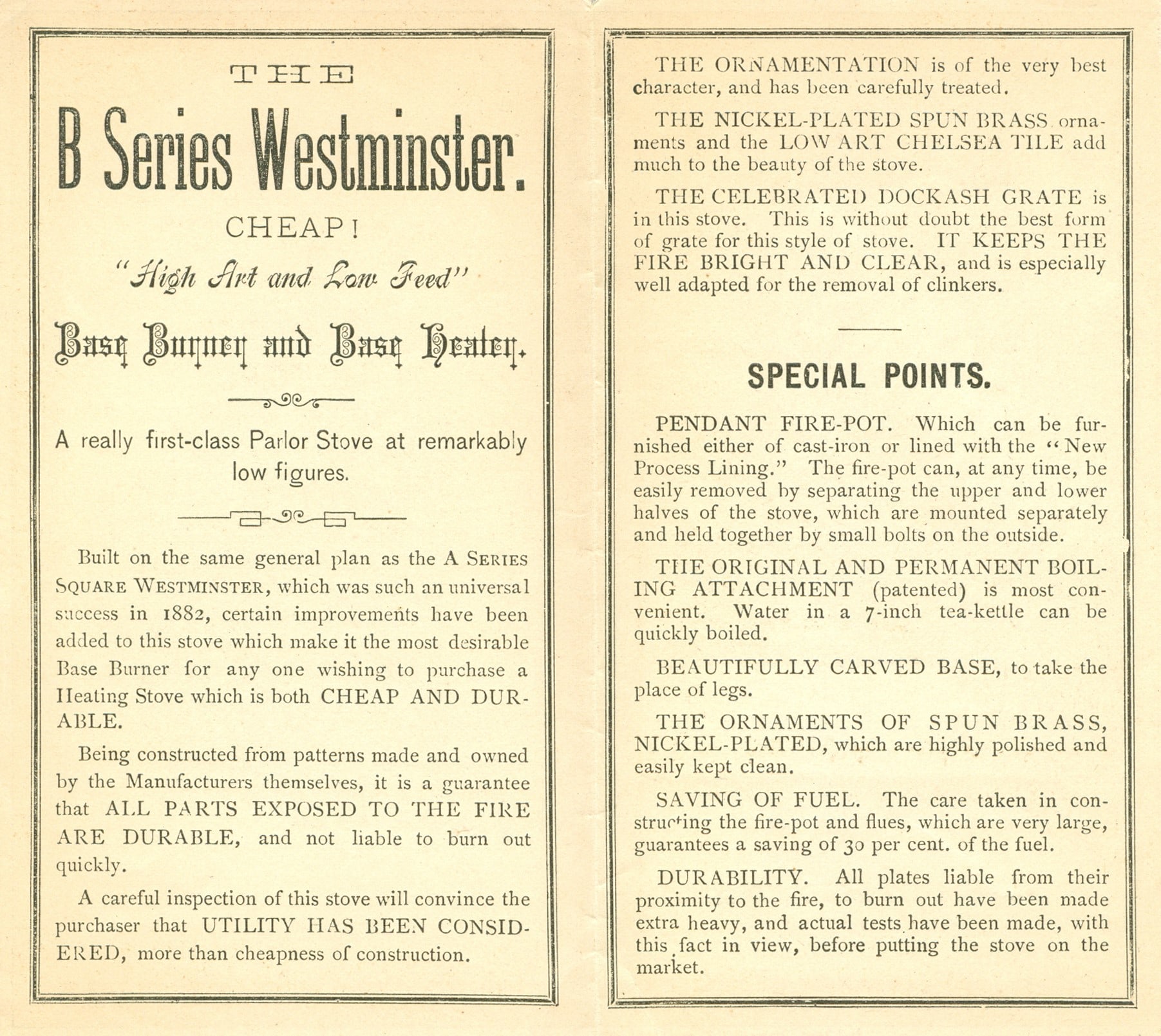 Trade card for the Westminster Base Burner by Rathbone, Sard & Co. of Albany, Chicago, and Detroit. This particular card was used by E. Drake, an agent in Syracuse, New York.