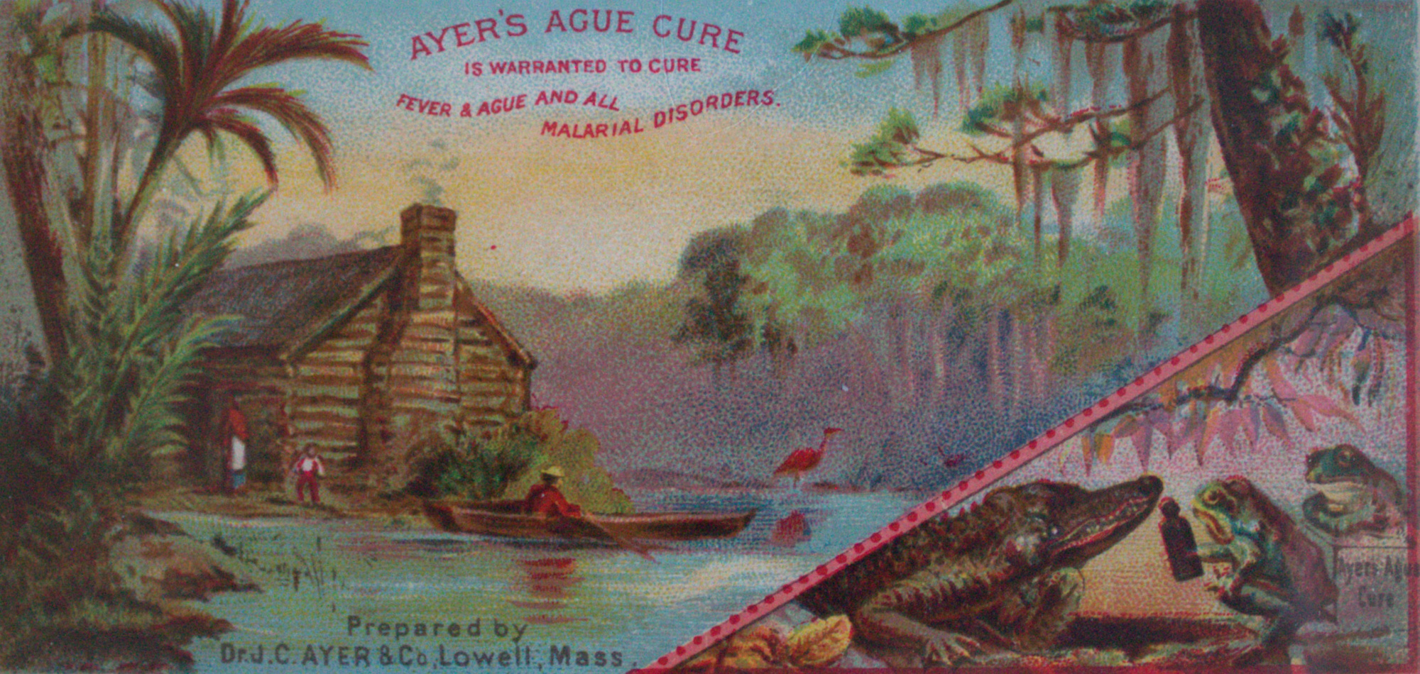 Trade card for Ayer's Ague Cure depicting a log cabin on a lake. Frogs offer medicine to an alligator in the lower right corner.