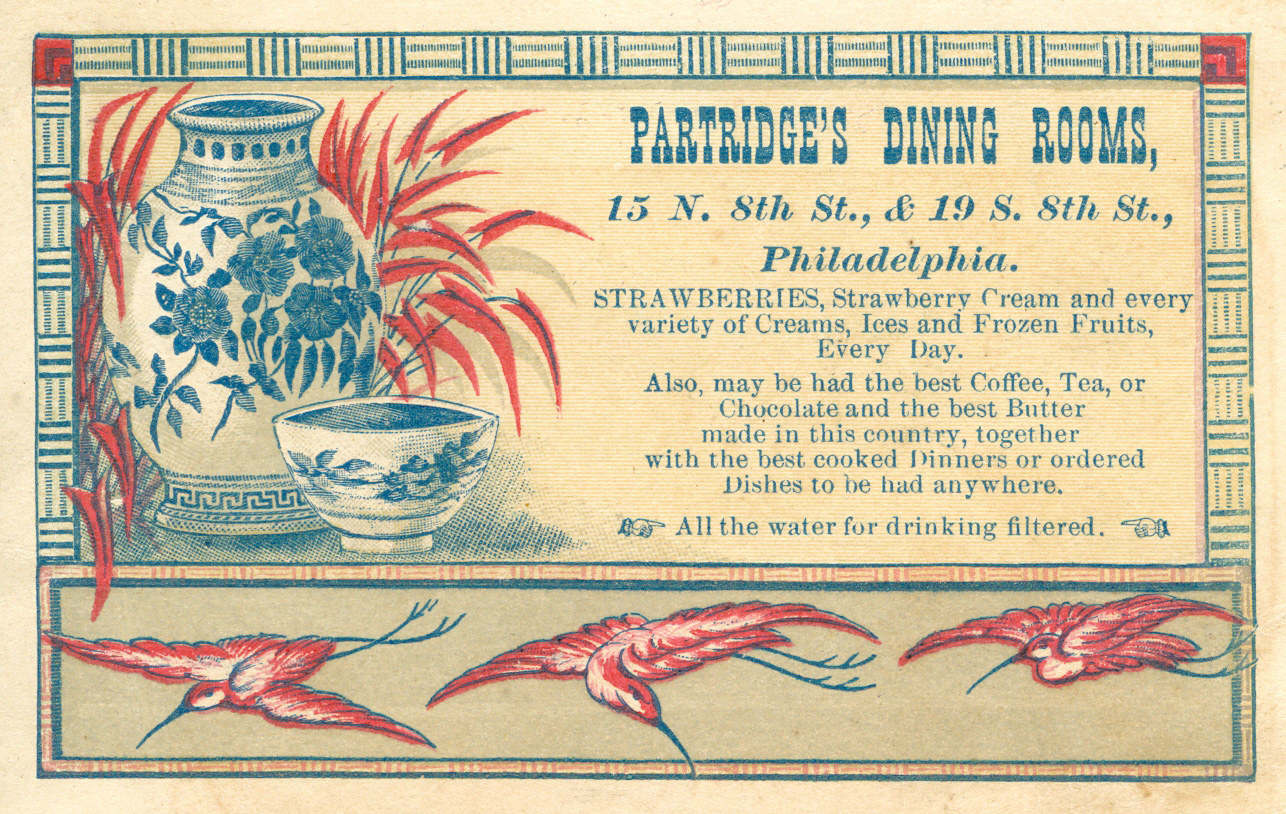 Trade card advertising Partridge's Dining Rooms, Philadelphia.