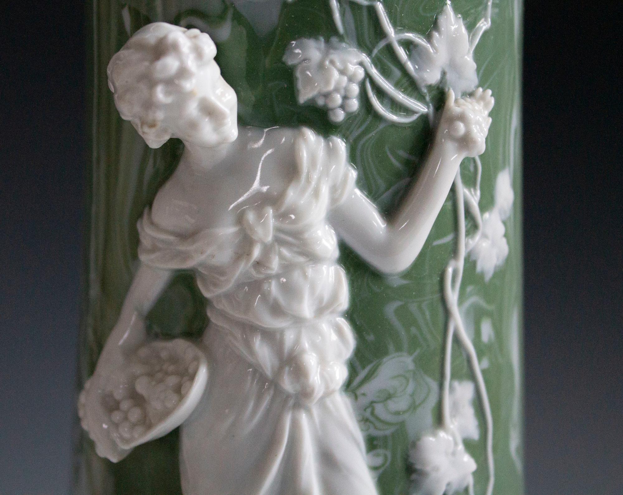Pate sur pate porcelain vase with woman and cherub picking grapes. Vase is coated in green marbled glaze.