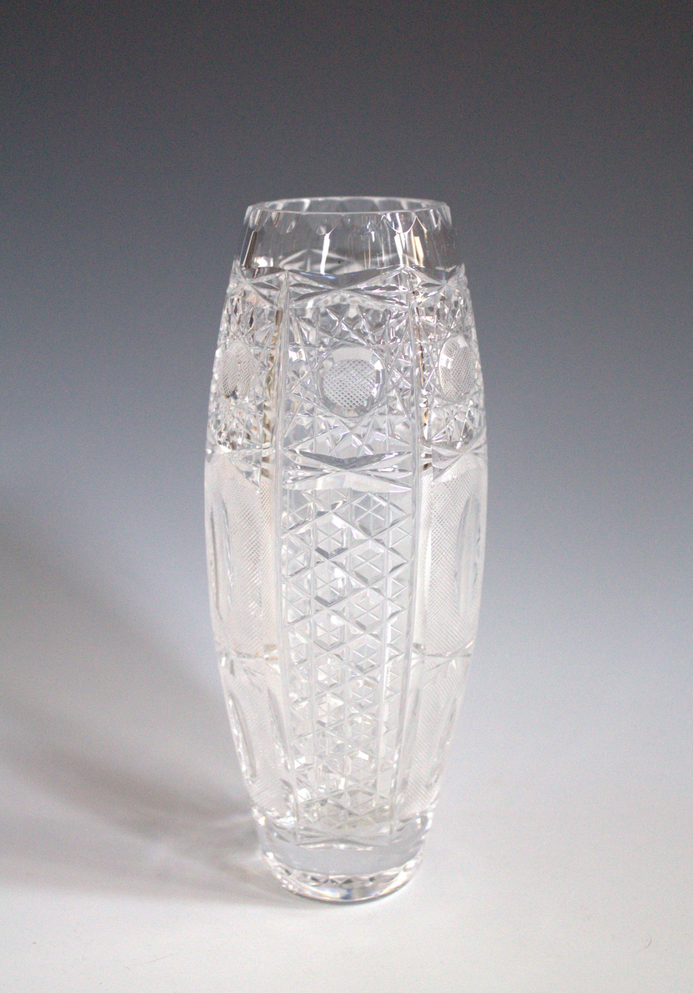 Small cut glass vase in a tapered cylinder form.