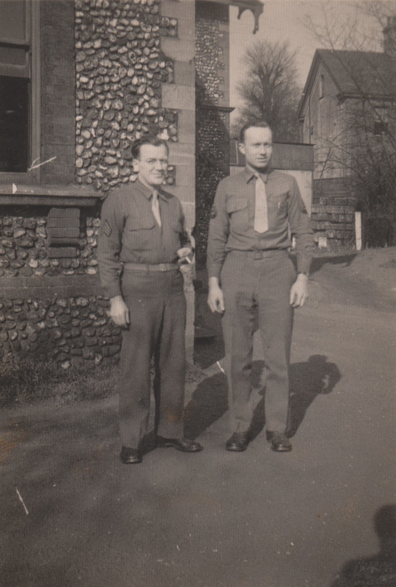 Depicts Army Air Force soldiers in England. The men are identified as Sergeant Jimmie Laing, Corporal Bob Theisen, Frank North, Sergeant Fayron Moore, and First Sergeant Joseph Fisher.