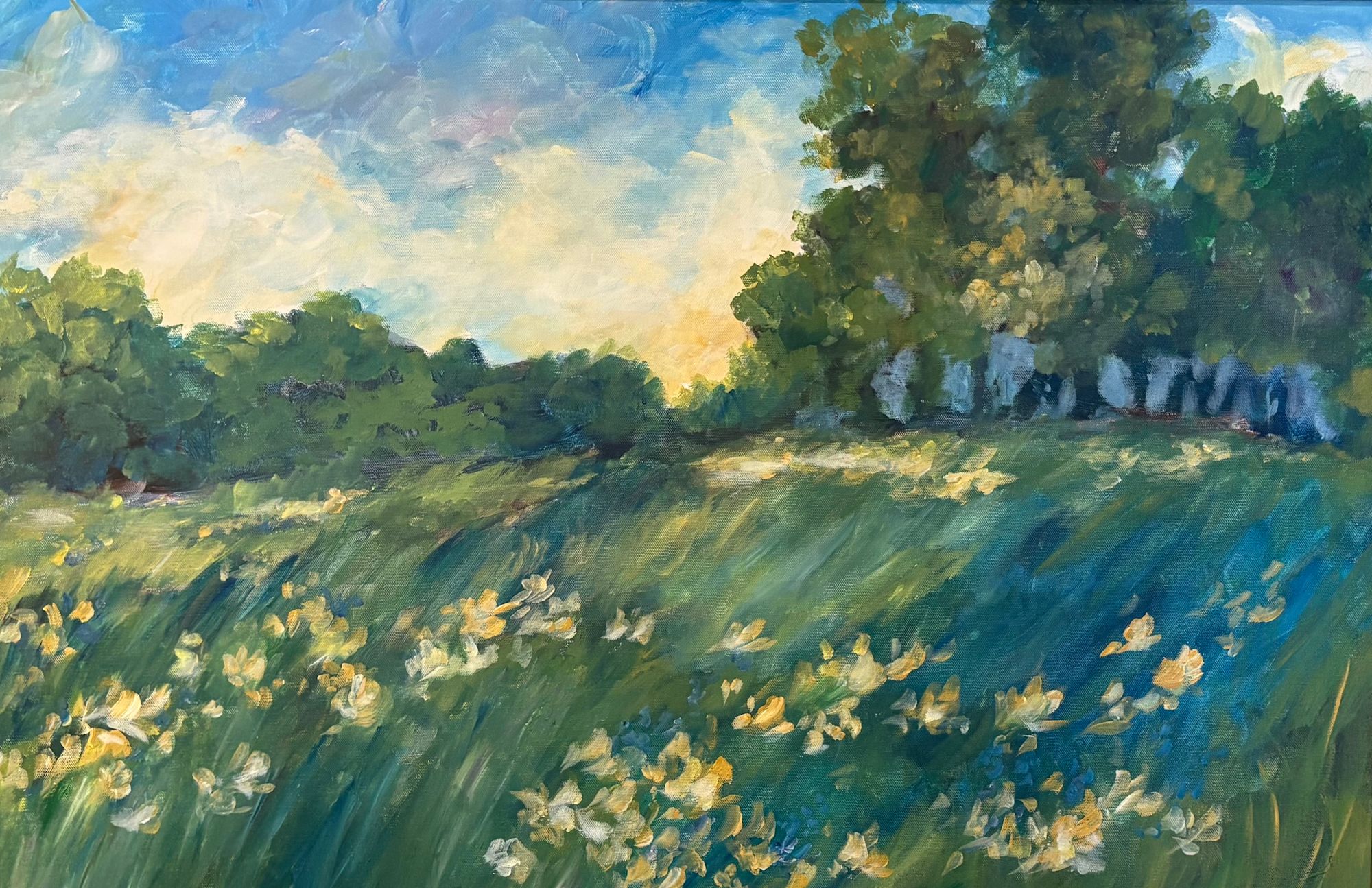 A peaceful meadow glows beneath the fading summer light, where soft yellow blooms lean toward the horizon. Loose, expressive brushwork captures the movement of grass and the warmth of the evening air—a reflection of fleeting beauty and the quiet magnificence found in simple moments.