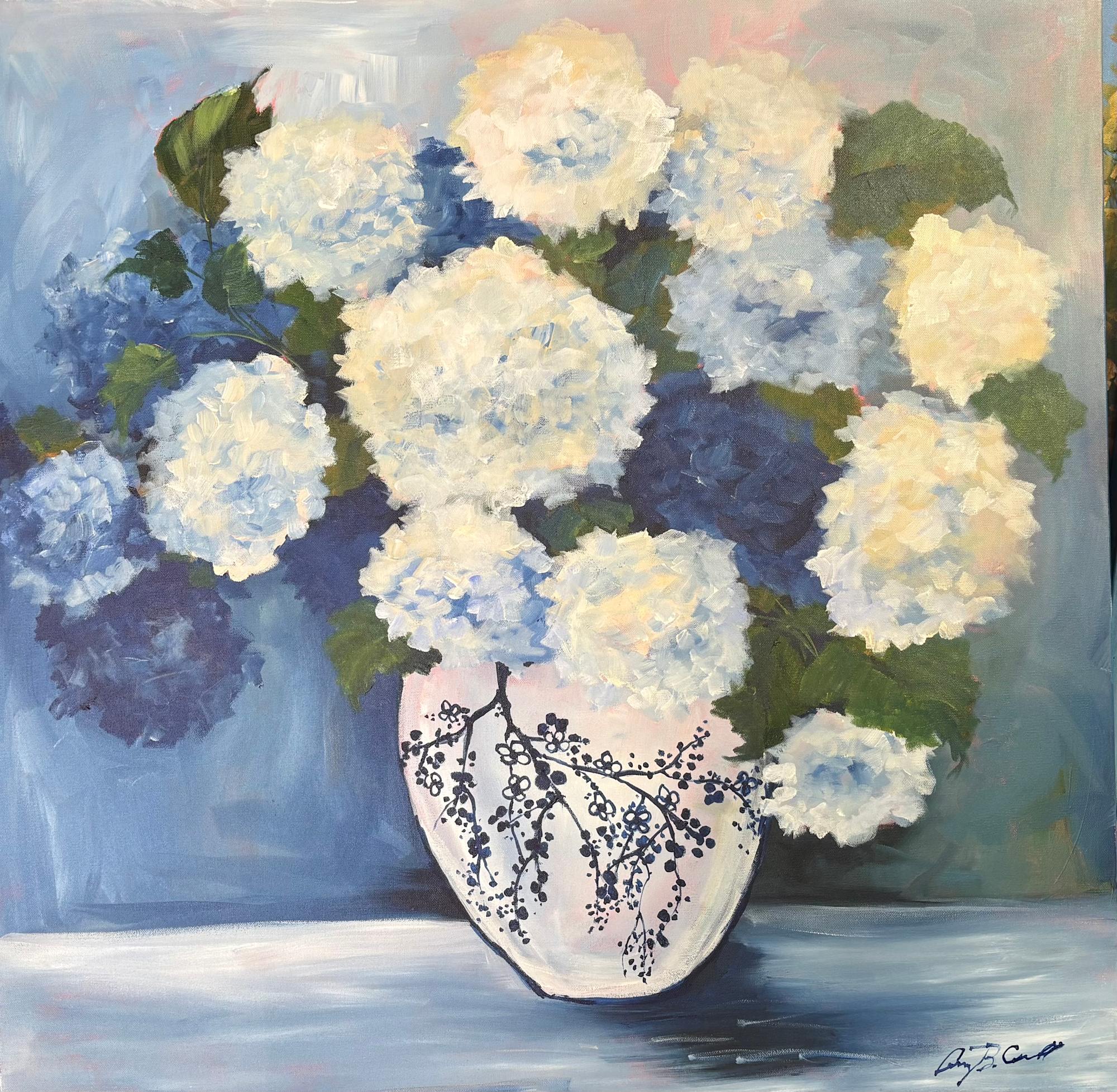 Inspired by the blue and white hydrangea centerpieces at a family wedding. Guests were invited to take the blooms home and this bouquet - now painted in soft, layered brushstrokes- preserves the joy, beauty and love of that day.