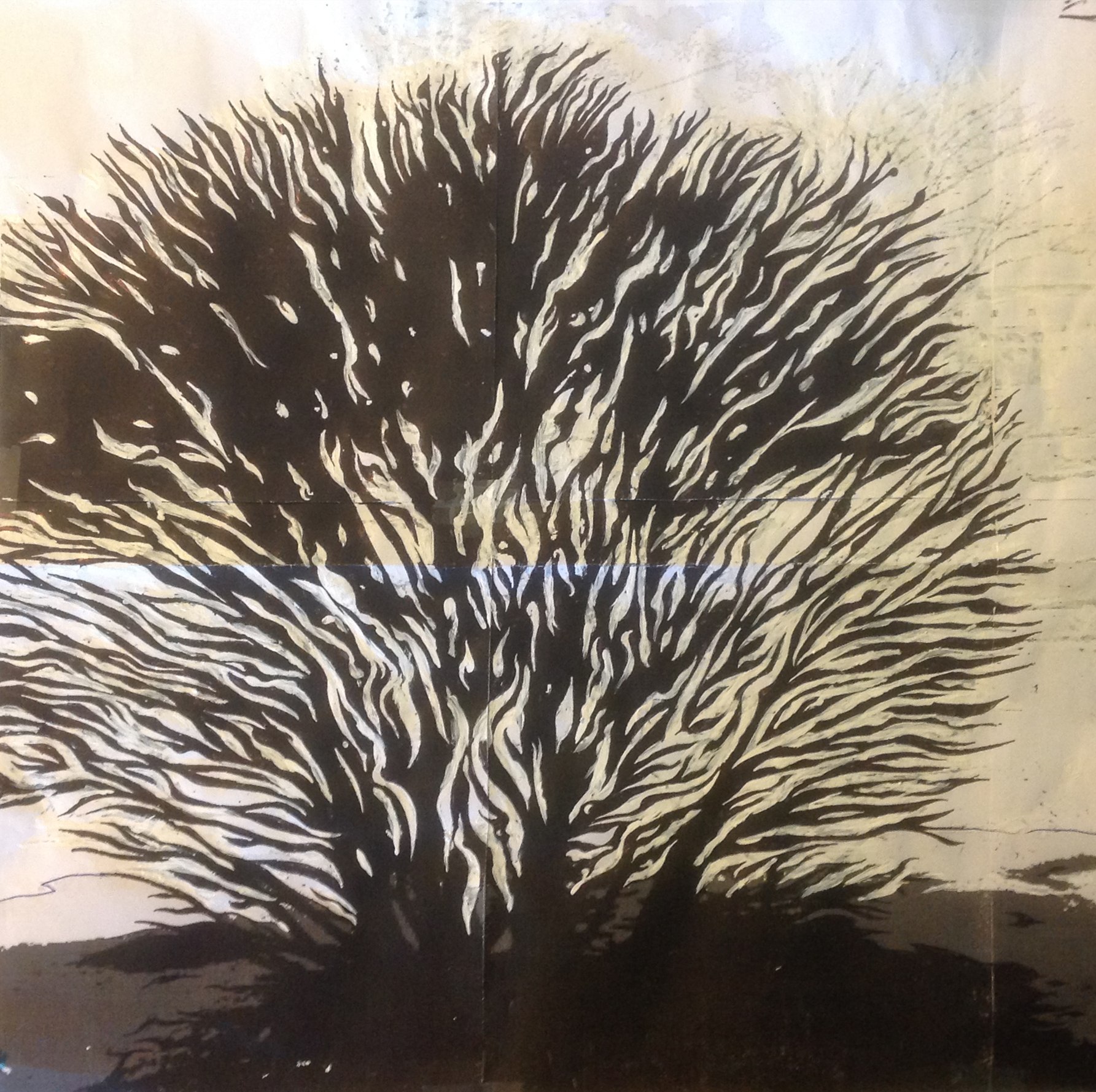 So I did a line drawing based on my photo of the bush, intending the resulting painting to be dark-shrub-on-yellow-background type of piece – almost a silhouette. The plant figure itself does have color, but the colors are dark, and relatively flat and un-modulated (not shaded or blended). As an experiment, instead of modulating the darkness in the lines of the shrub, I modulated the yellow in the background, going from a yellow-greenish sky toward a sunny yellow towards the base.