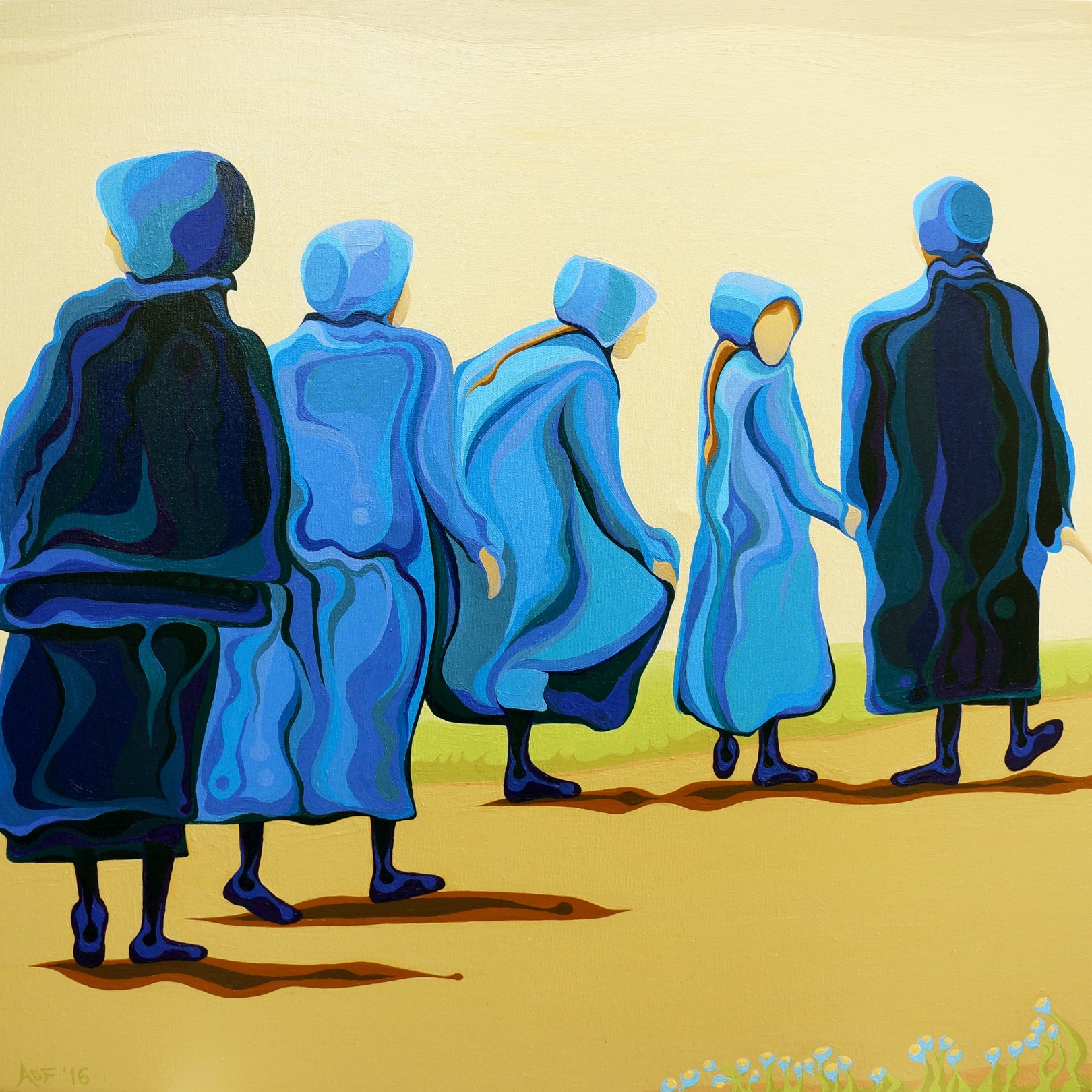 A typical scenario on any given summer Sunday in the Region of Waterloo - people are out enjoying the fresh air and sunshine along a rural roadway. These 5 Mennonite ladies are purposely depicted without faces, as the Mennonites prefer not to have their images captured in photographs.