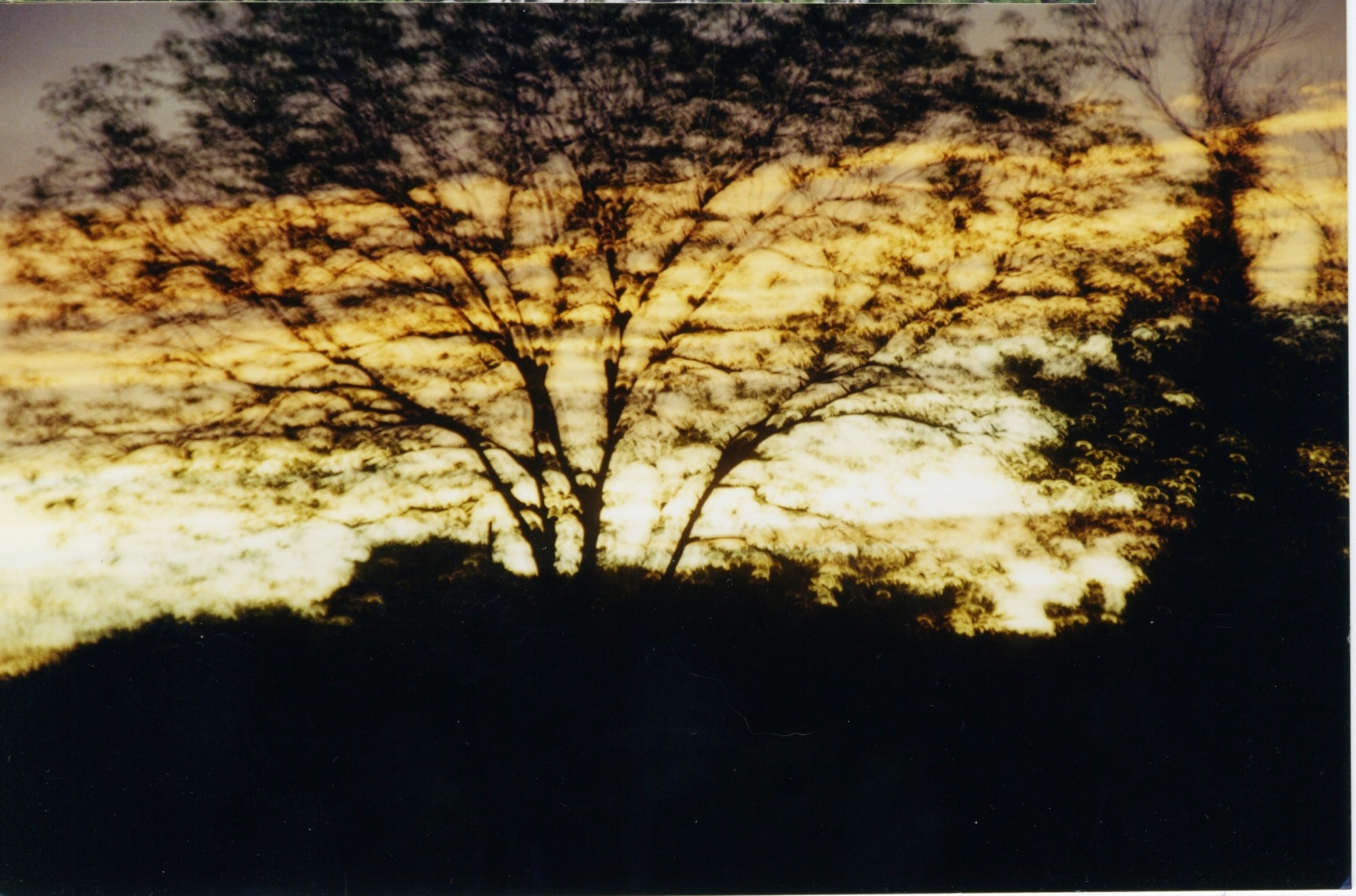 A tree's branches are weaving a tapestry with a sunsetting sky.
