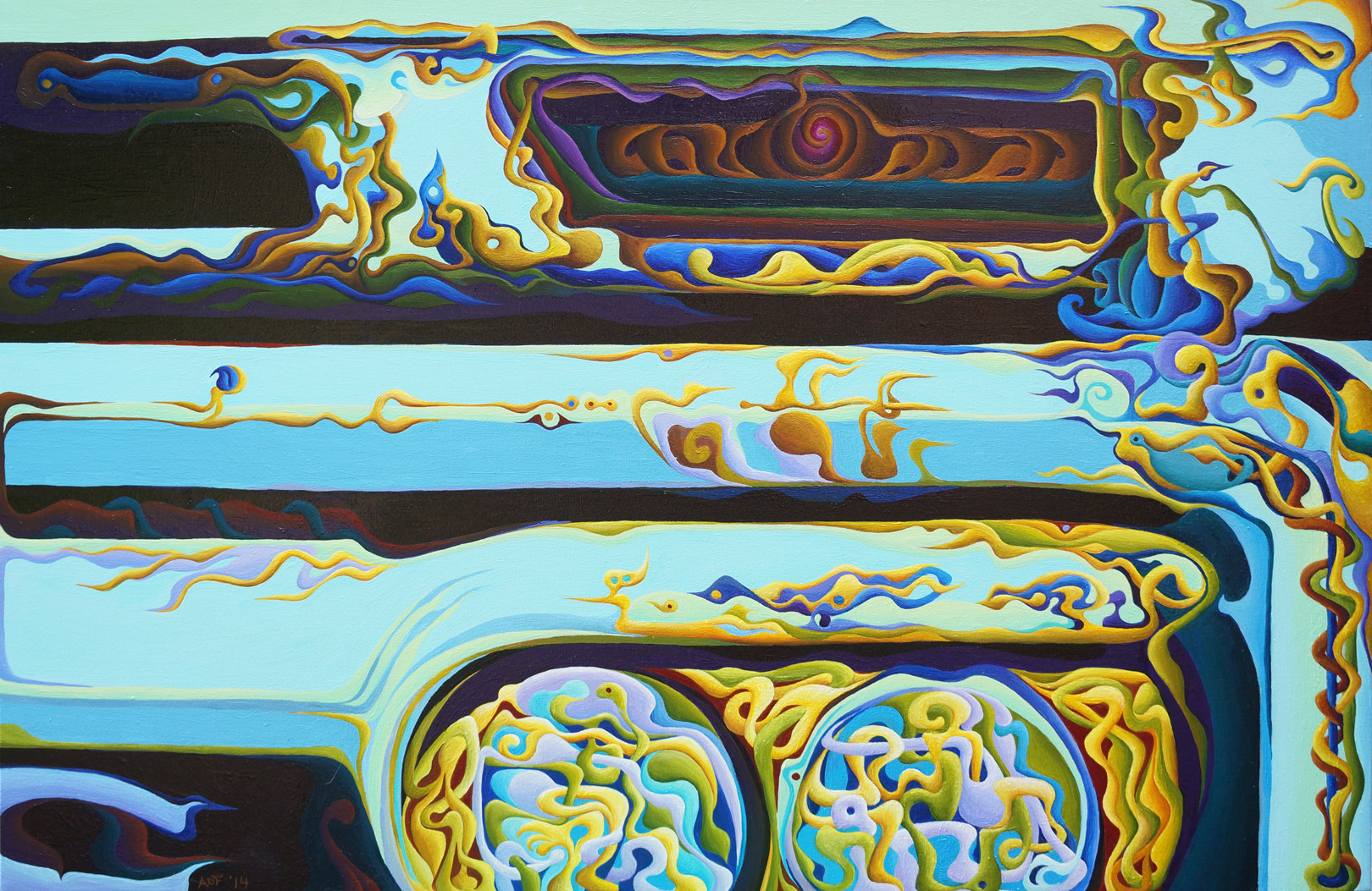 The mood of this painting has a quiet playfulness, like kittens playing around upon the dignified mother cat, silently observing and not intervening. The rust plays the part of the kittens; the vintage vehicle plays the part of the older, wiser cat.