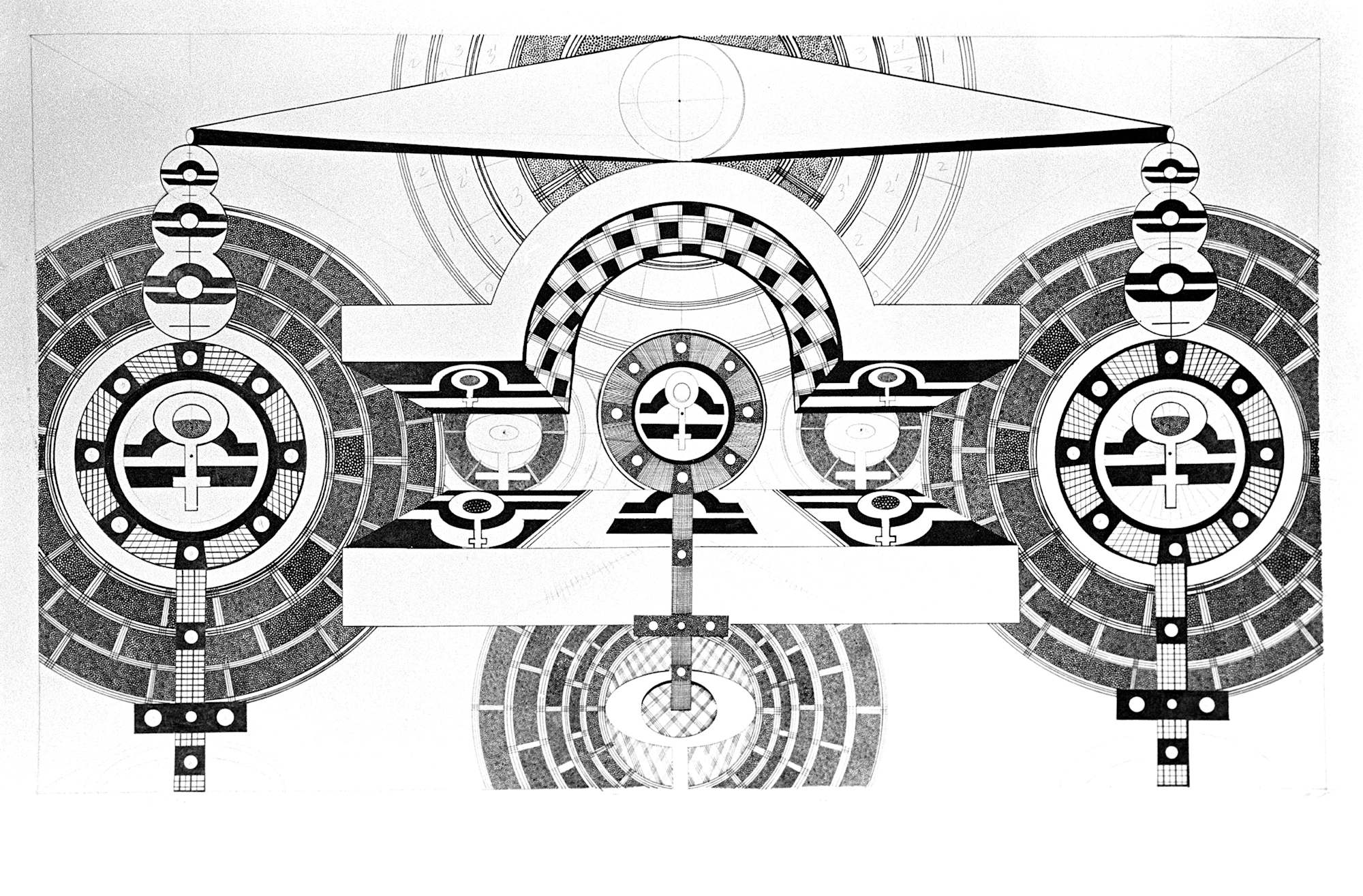 Libra is a lost piece of the astrology series. The series was developed between 1981 and 1985. All of the pieces began with the symbol of a sign. Sometimes the symbol of the ruling planet were used to create a counterpoint for the design. In this case the symbol of the planet Venus is evident in the sketch.