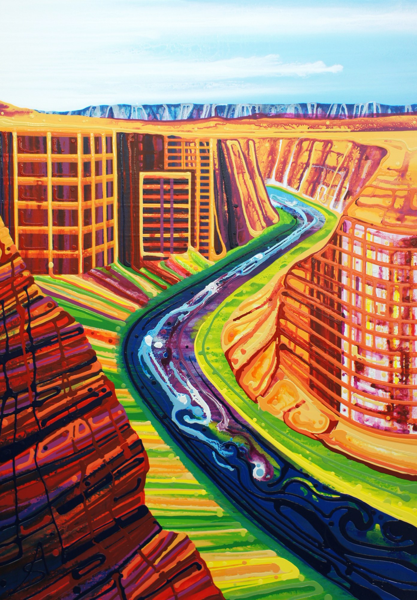 Shackleton drips, pours and layers liquid paint to depict our uncertain future – be it utopian or apocalyptic.