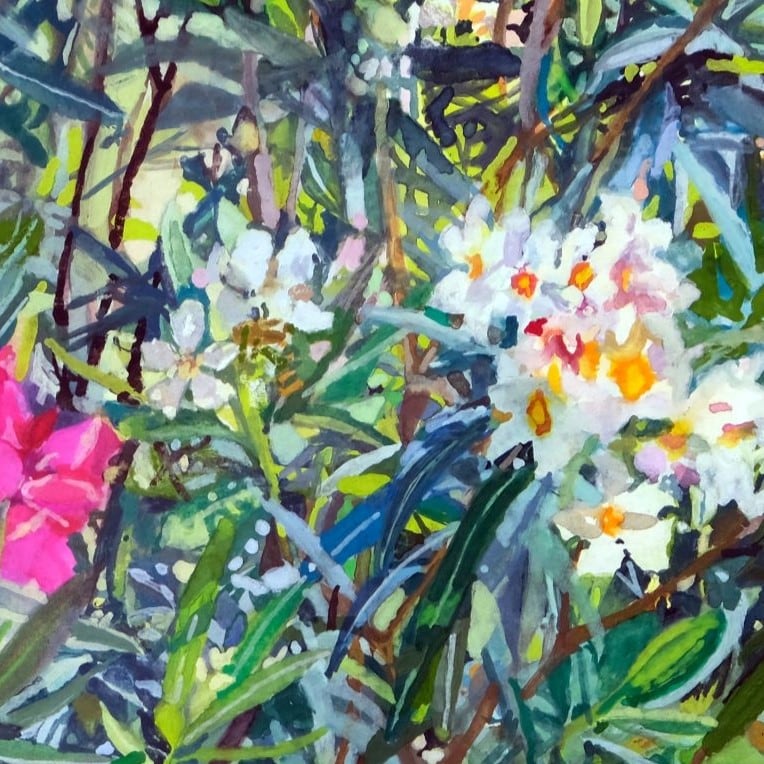 Vibrant, lush and dense. This gouache painting with water soluble koi pen is on Fluid 100 cold press 8 x 10 paper. It is framed shadow box style in a deep warm brown wood which brings out the browns in this tropical beauty. Framed with archival material and glass, ready to hang.