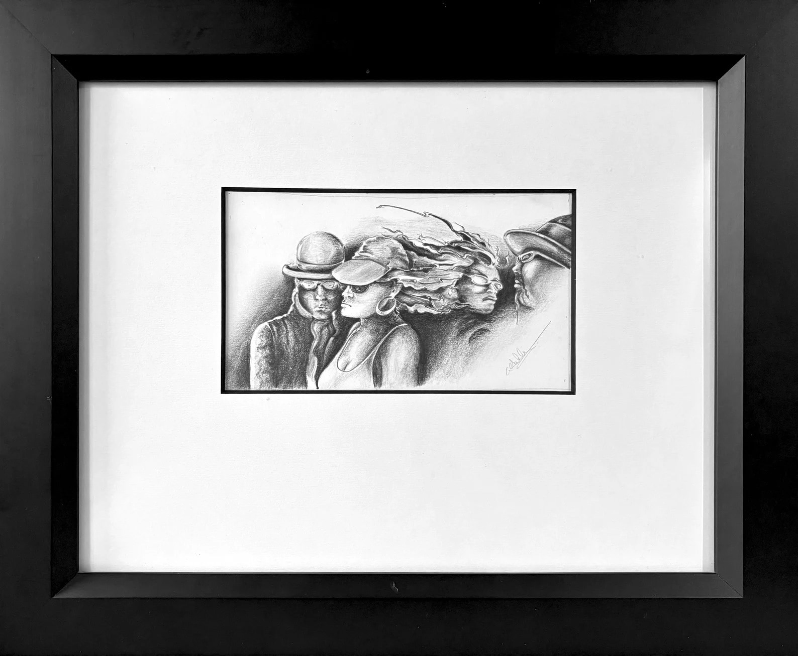 Four figures engage in a silent conversation, their hats and flowing hair adding an element of movement to the scene. The detailed pencil work enhances the mysterious and contemplative atmosphere of their connection."