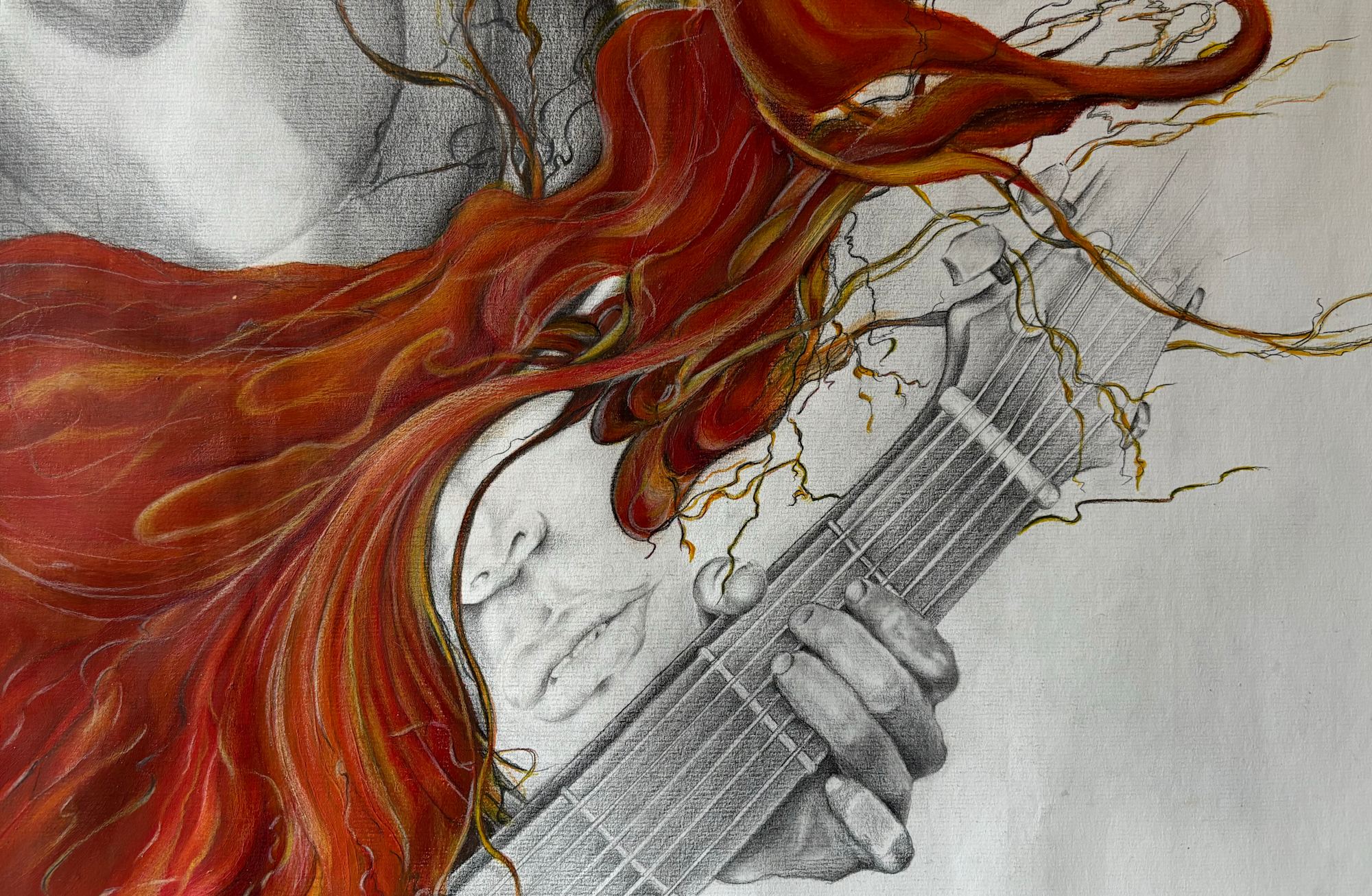 - Subject Matter: Red Head is a Dessin Crayon HB artwork that captures the deep bond between a musician and their instrument. The piece contrasts a realistic face and hand with abstract, fiery hair merging into guitar strings, symbolizing the passion and energy of music.