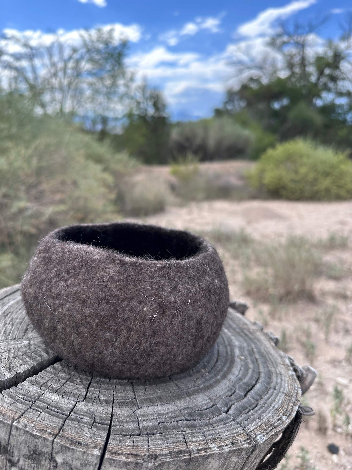Made by hand from Finn and merino wools using a wet-felting process. This piece offers a lightweight soft, sturdy sanctuary that can be displayed on a surface or wall (I like to use t-pins). This vessel is sturdy enough to act as a "pod/shelf" for small objects.