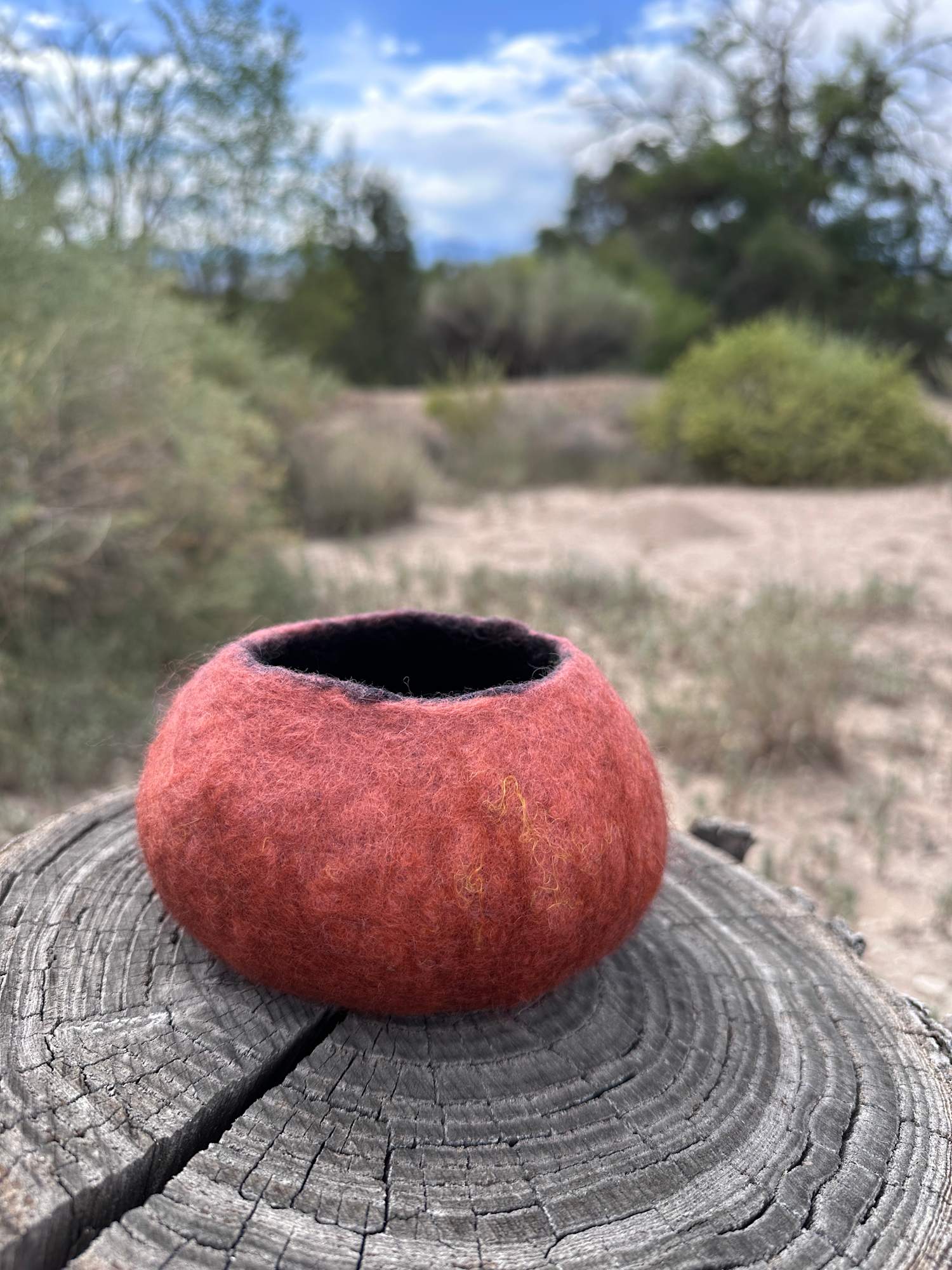 Handmade by wet-felting eco-dyed merino wools and flax fibers. This piece offers a lightweight soft, sturdy sanctuary that can be displayed on a surface or wall (I like to use t-pins). This vessel is sturdy enough to act as a "pod/shelf" for small objects.