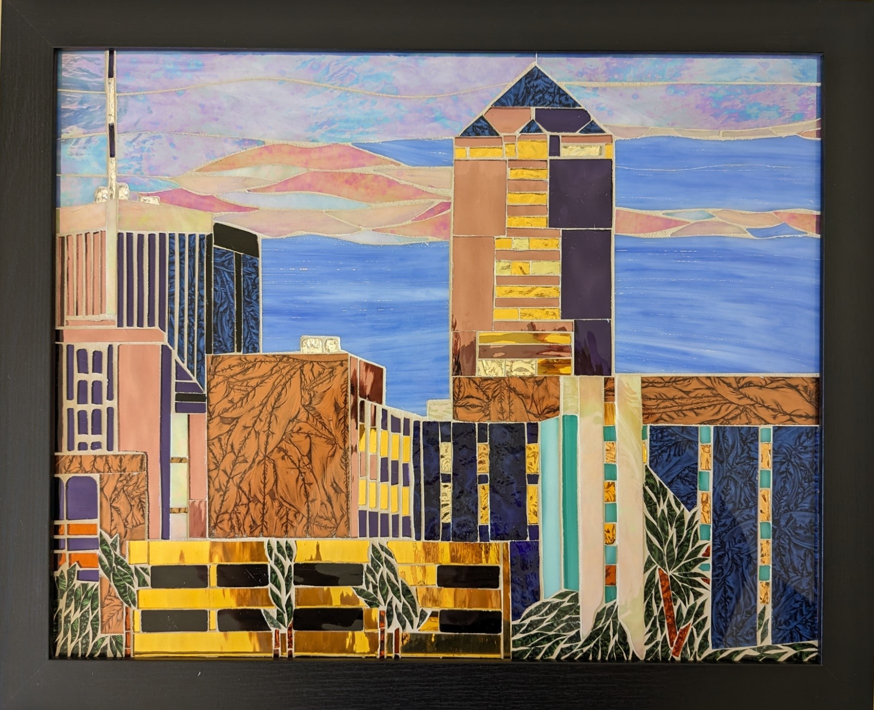 I took a photo of the Tucson downtown skyline at sunset, posterized it, and used it to create this mosaic. I used all reflective art glass (mirror, opalescent, Van Gogh, etc.). All materials were scrap from other artists, thanks!