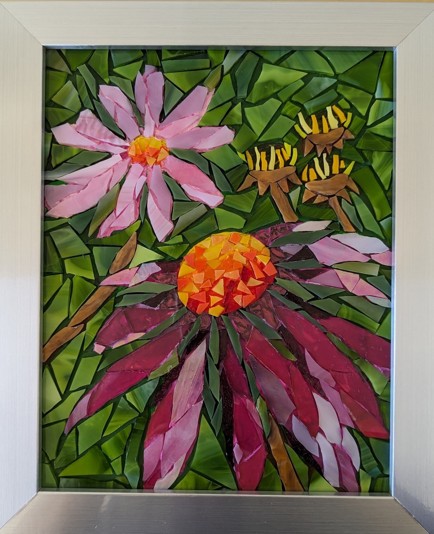 This is an ungrouted mosaic. The technique uses acrylic paint and modeling paste to create the background coloring (as well as serving as an adhesive).