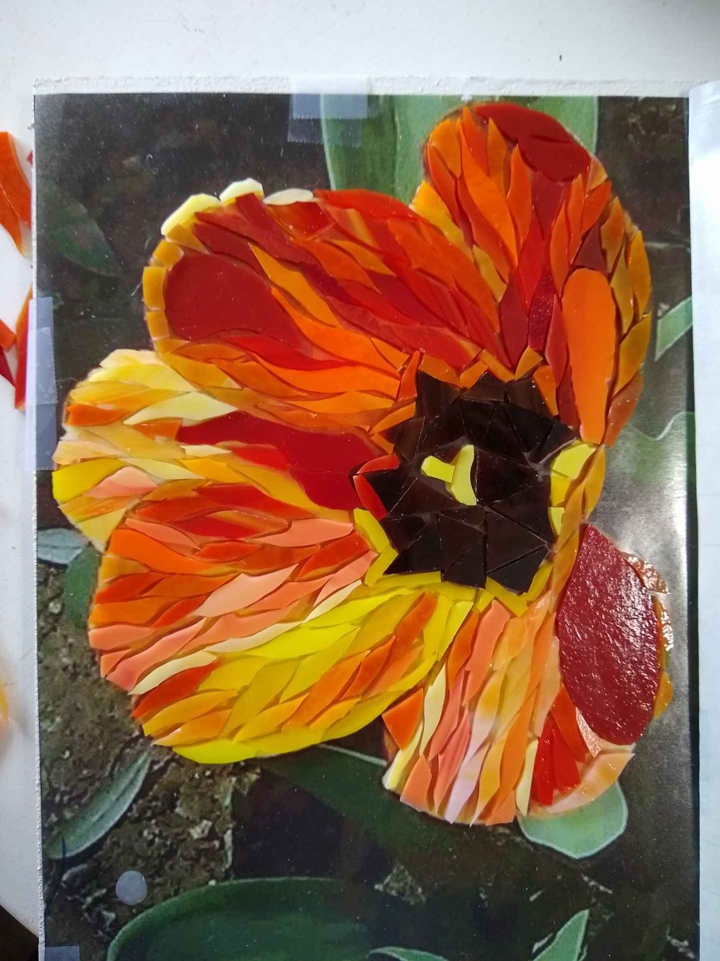 I wanted to replicate this photo of Mexican poppies that I took on a hike. To make it more realistic, I used the 'paint brush strokes' method and several colors of grout.