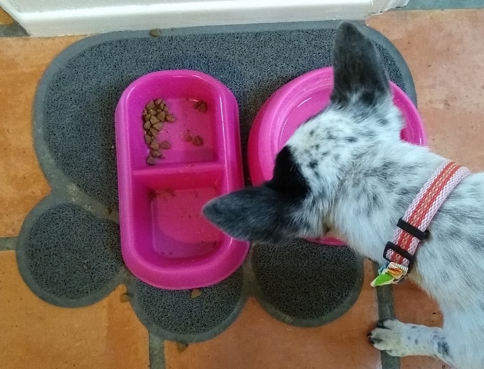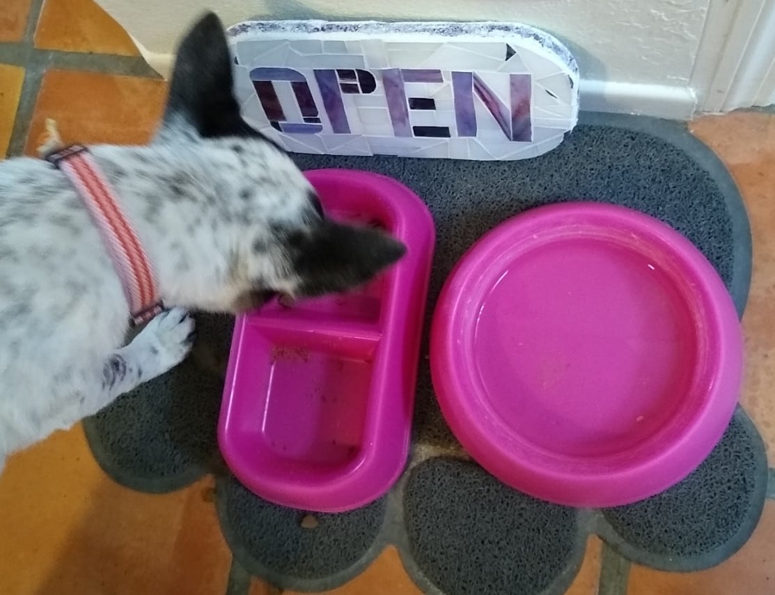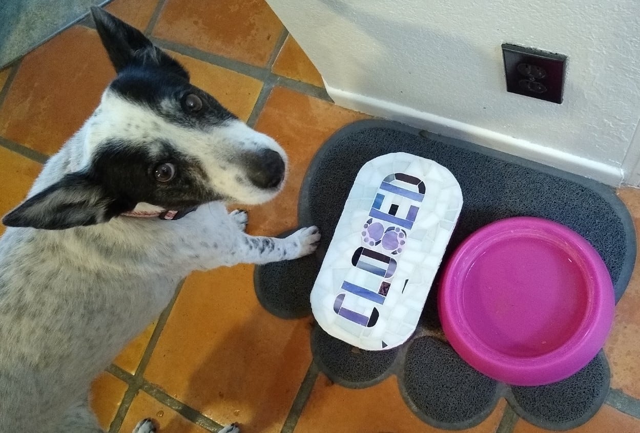 This was custom made for our dog, Freckle. When she doesn't finish her food, it draws flies. So, I made this two-sided (water proof) cover for her food bowl. The "closed" side shows when the bowl is covered. When the bowl is "open," I just place it next to her bowl.