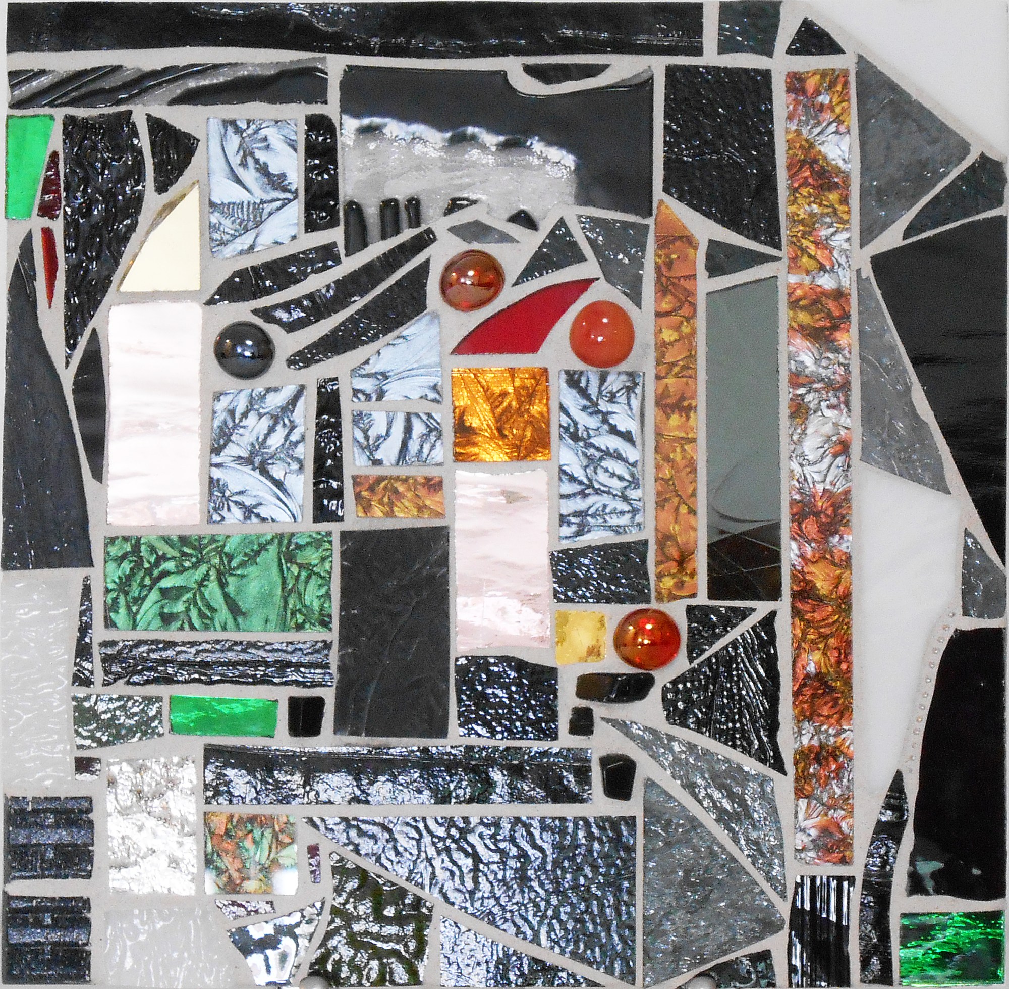 Green Monotone (6" x 6" x 1"): Started with one black/gray scrap of glass and the similar colors – grays, blacks, and whites – complimented by touches of green. Companion piece to Red Monotone (12" x 12" x .5"). Each of the two had at least one color from the other one, to tie them together even though they are basically monotone.