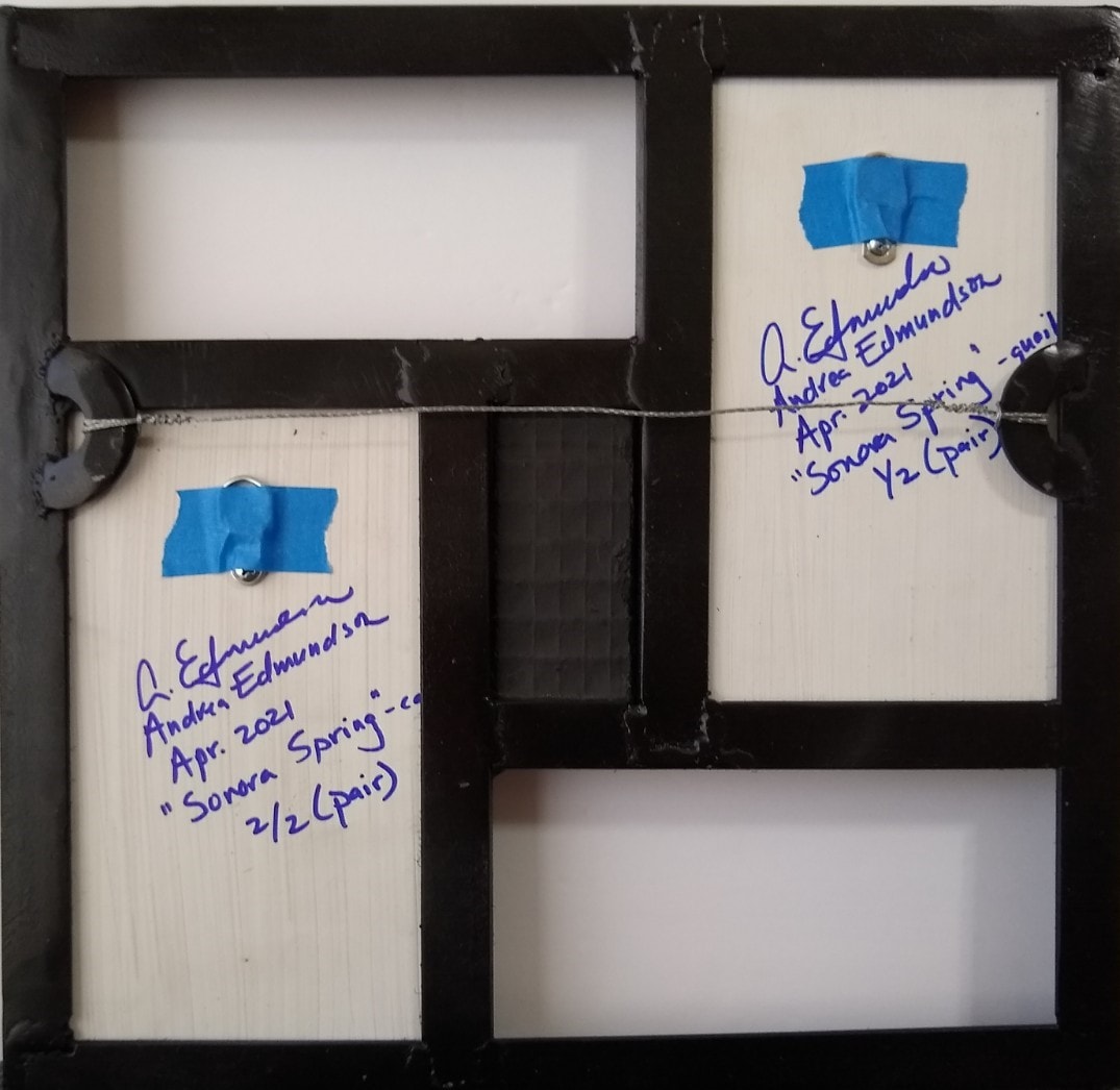 A common sight in the spring in the Sonoran Desert - quail and cactii. The quail is the first in the pair; the Saguaro cactus is second. Steel frame by metal artist Victor Quiros.