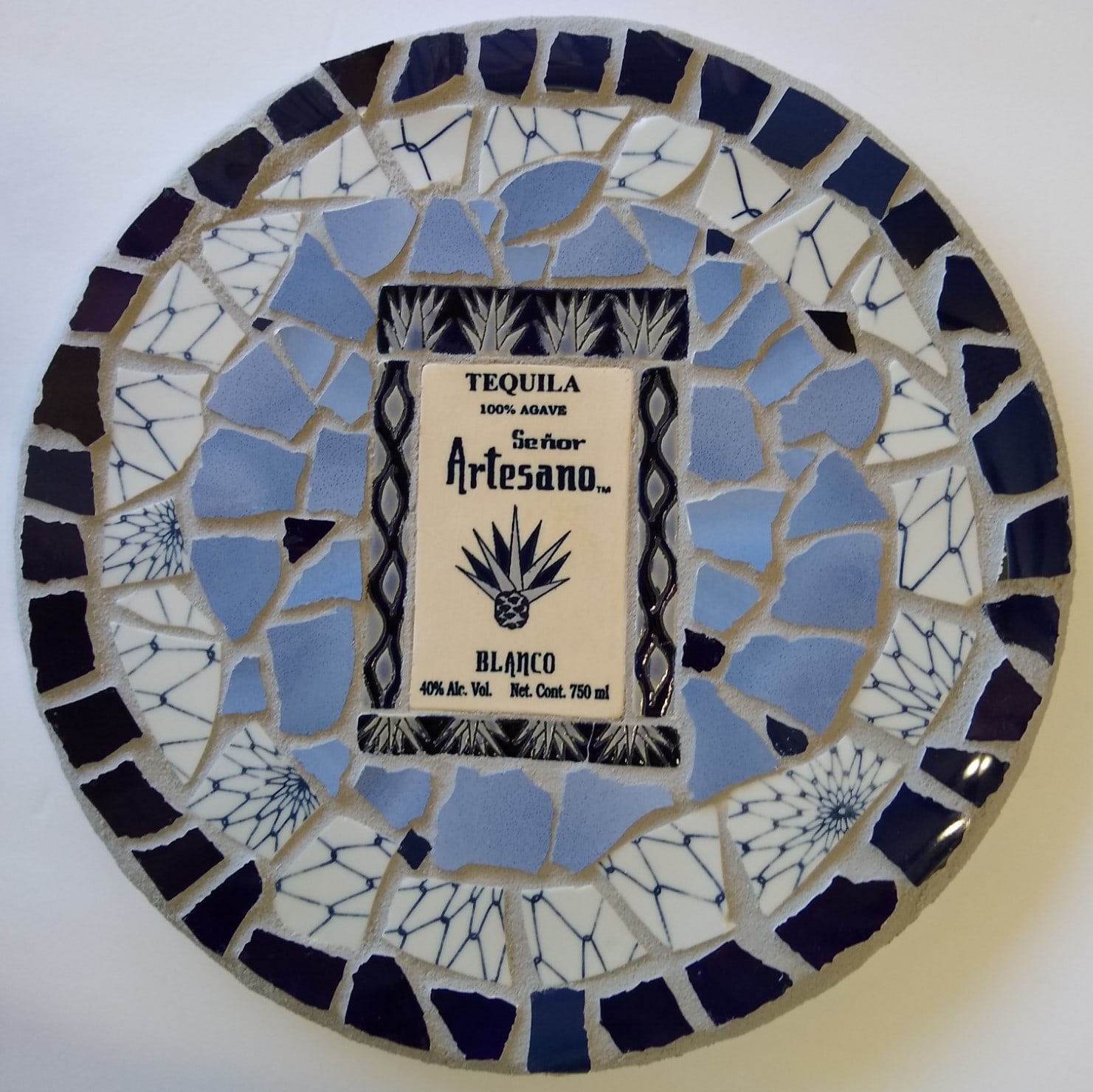 The tequila logo and agave tiles came off a tequila bottle! I popped them off with a palette knife. The spidery looking tesserae are from a broken plate given to me by a student and the dark blue tesserae were from other broken plates in my studio.
