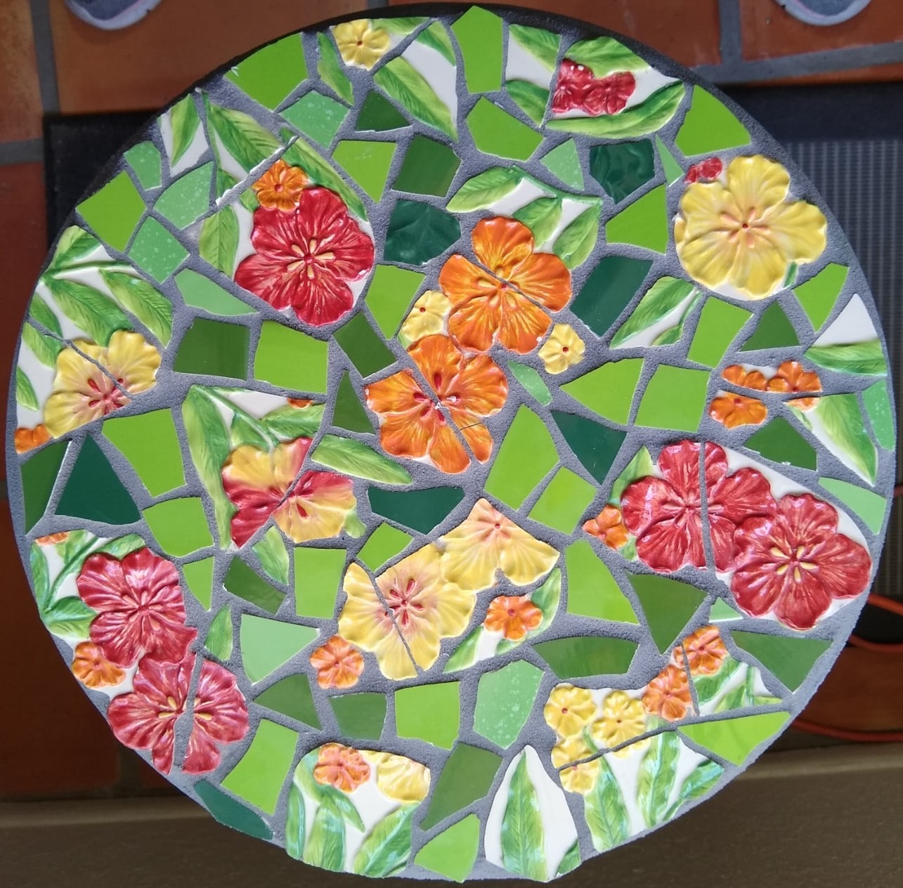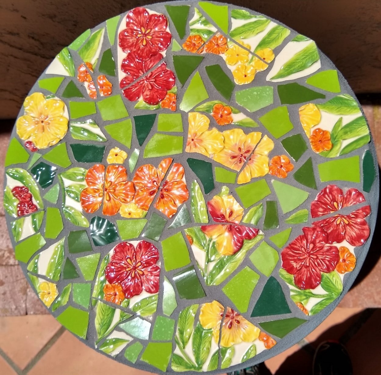 I've been wanting to used these vibrant flower pottery pieces for a long time. They make a great side table top. You can use it outdoors as long as it doesn't get a lot of rain. The substrate is wood, but the top is grouted with Mapei Flexcolor CQ, which is great for the outdoors. Table frame by metal artist Victor Quiros.