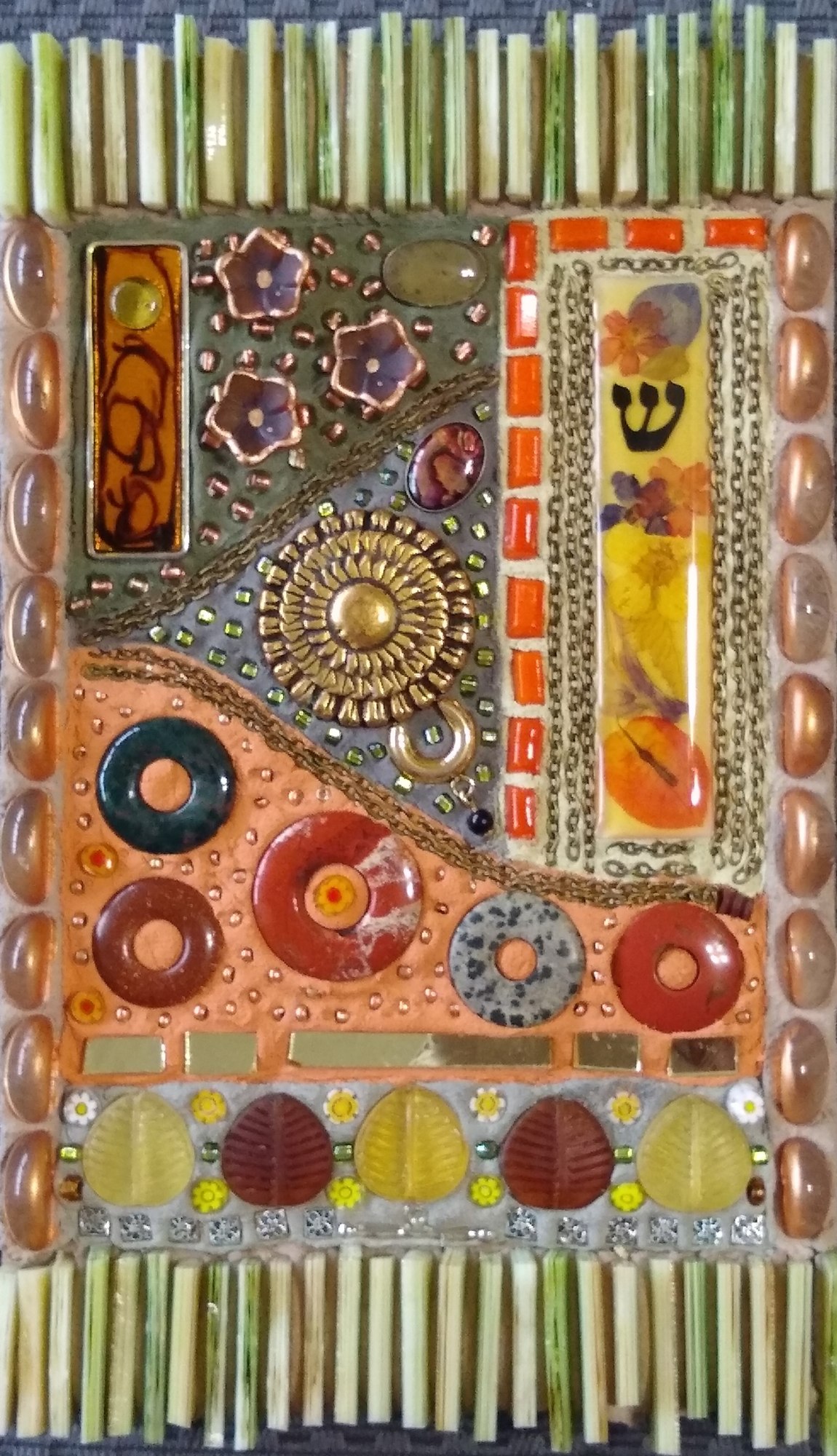 There's an allusion to eastern design in this piece. The copper and green tones are calming. It's reminder to consider the world calmly, clearly, and with good faith.