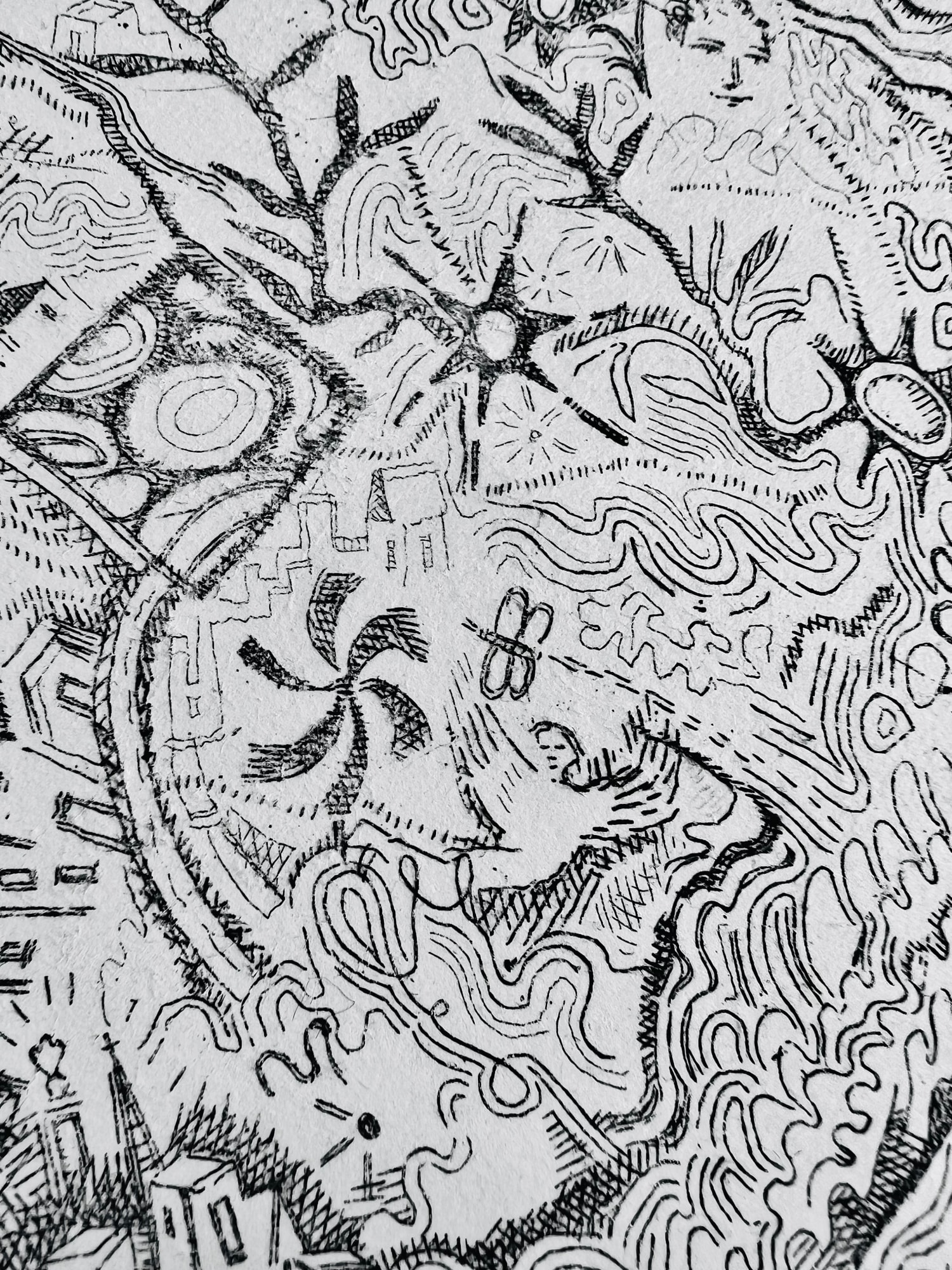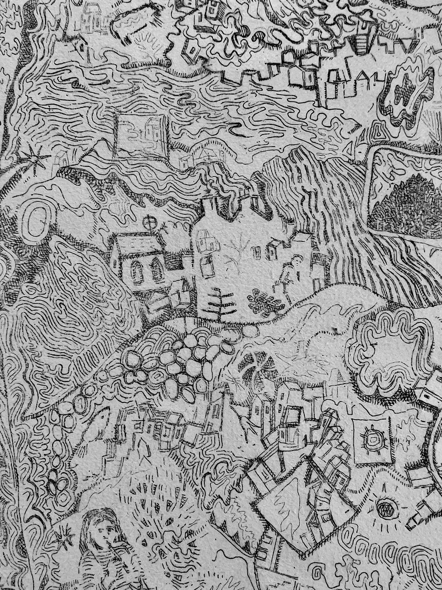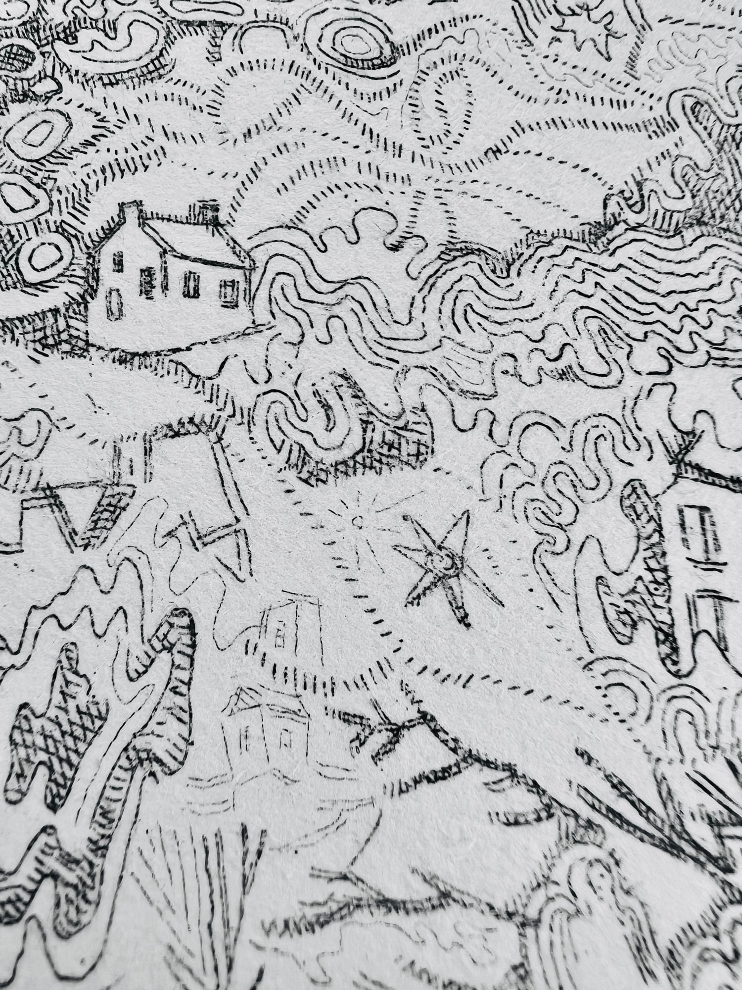 This etching was drawn onto a copper plate during the Summer months on a trip to West Cork, Ireland. The imagery has many references to William Blake's poetry as I was reading this at the time. The etching was originally titled 'Joy & Woe are Woven fine' - a line from William Blake. Then I realised that there was not very much woe there, although there is plenty of emotion to do with travel, life by the sea and music - any tears are tears of joy!