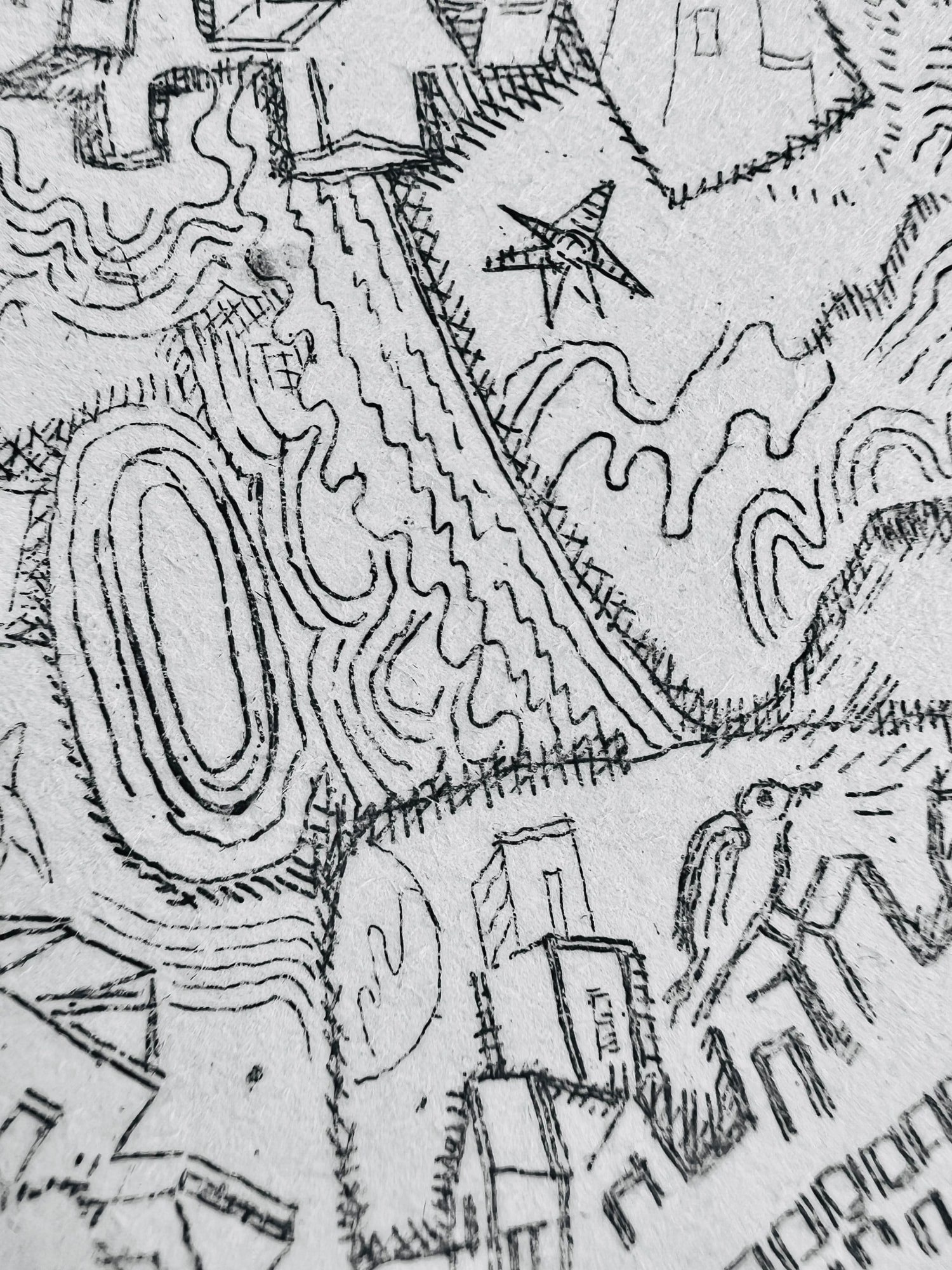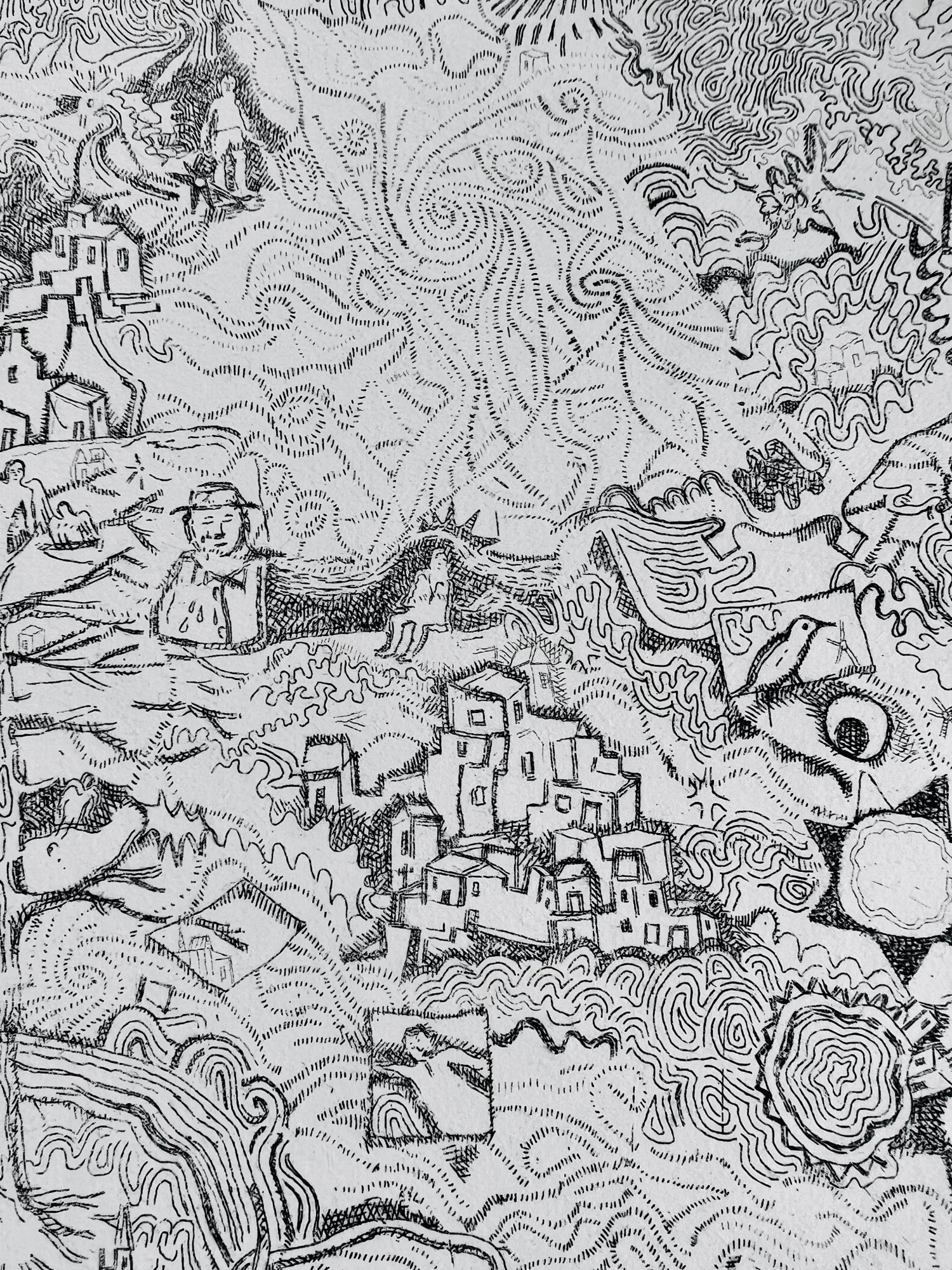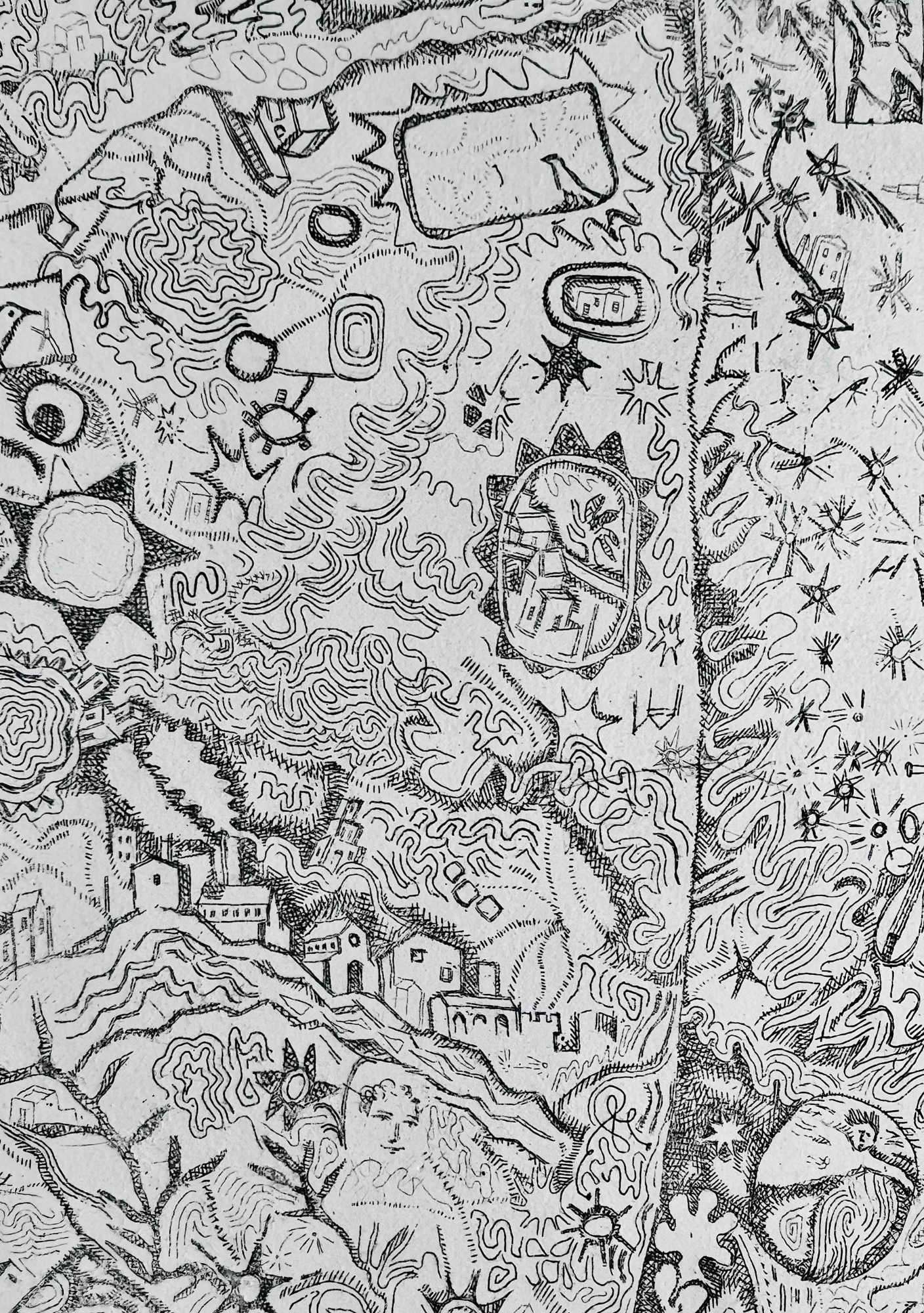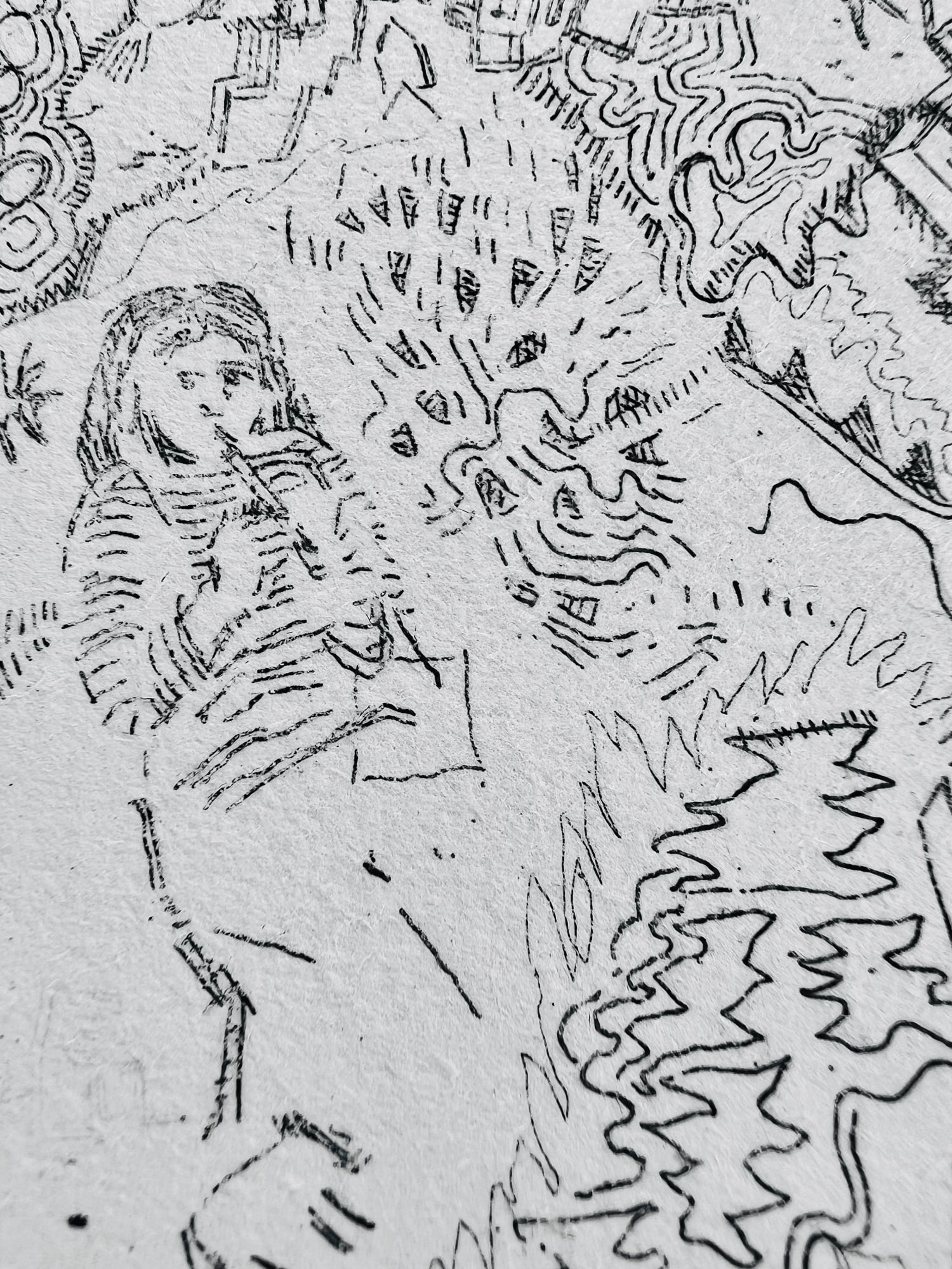 This etching was drawn onto a copper plate during the Summer months on a trip to West Cork, Ireland. The imagery has many references to William Blake's poetry as I was reading this at the time. The etching was originally titled 'Joy & Woe are Woven fine' - a line from William Blake. Then I realised that there was not very much woe there, although there is plenty of emotion to do with travel, life by the sea and music - any tears are tears of joy!