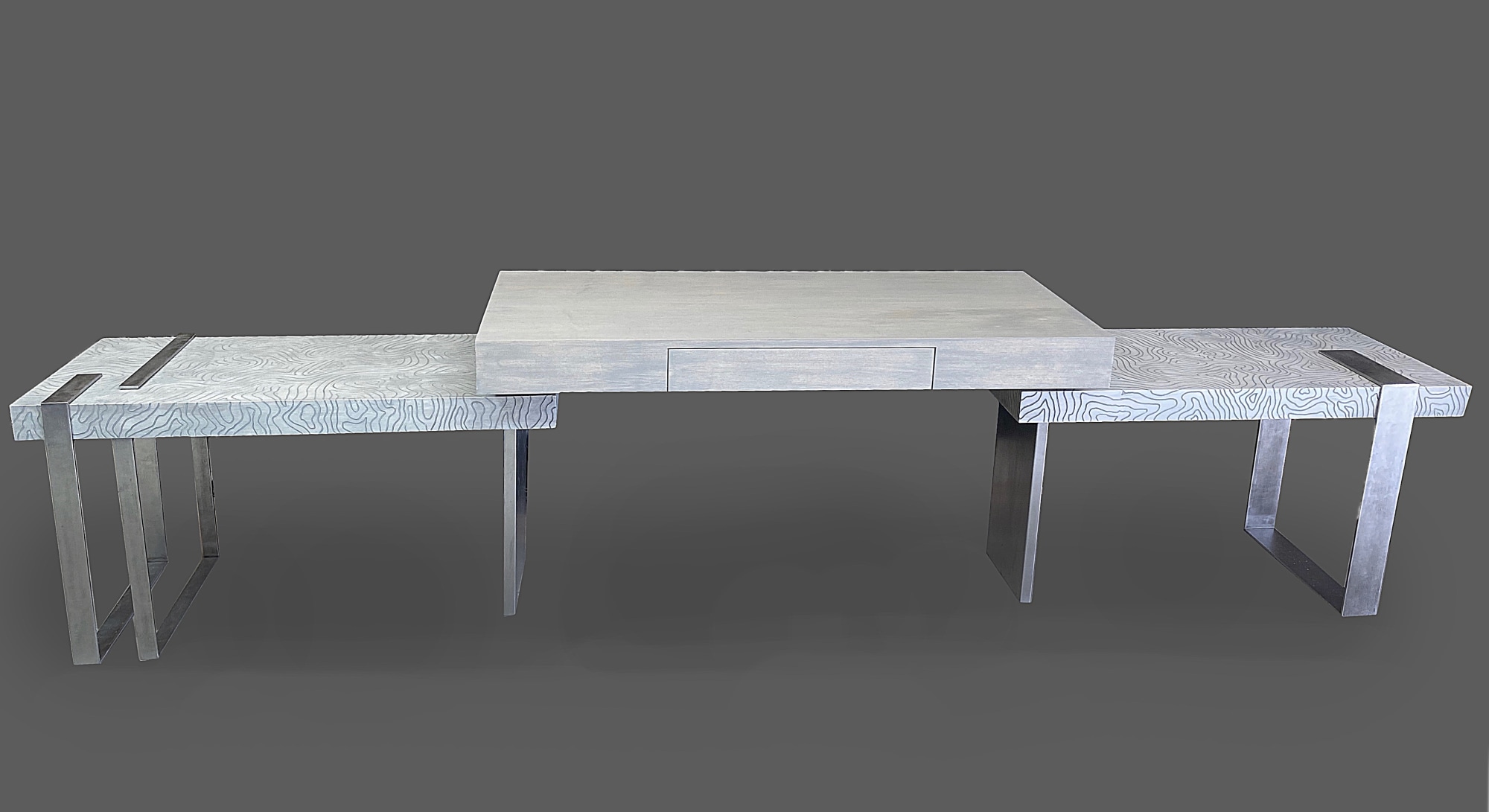 custom console desk, hand carved, steel legs and accents. custom pearlized finish,