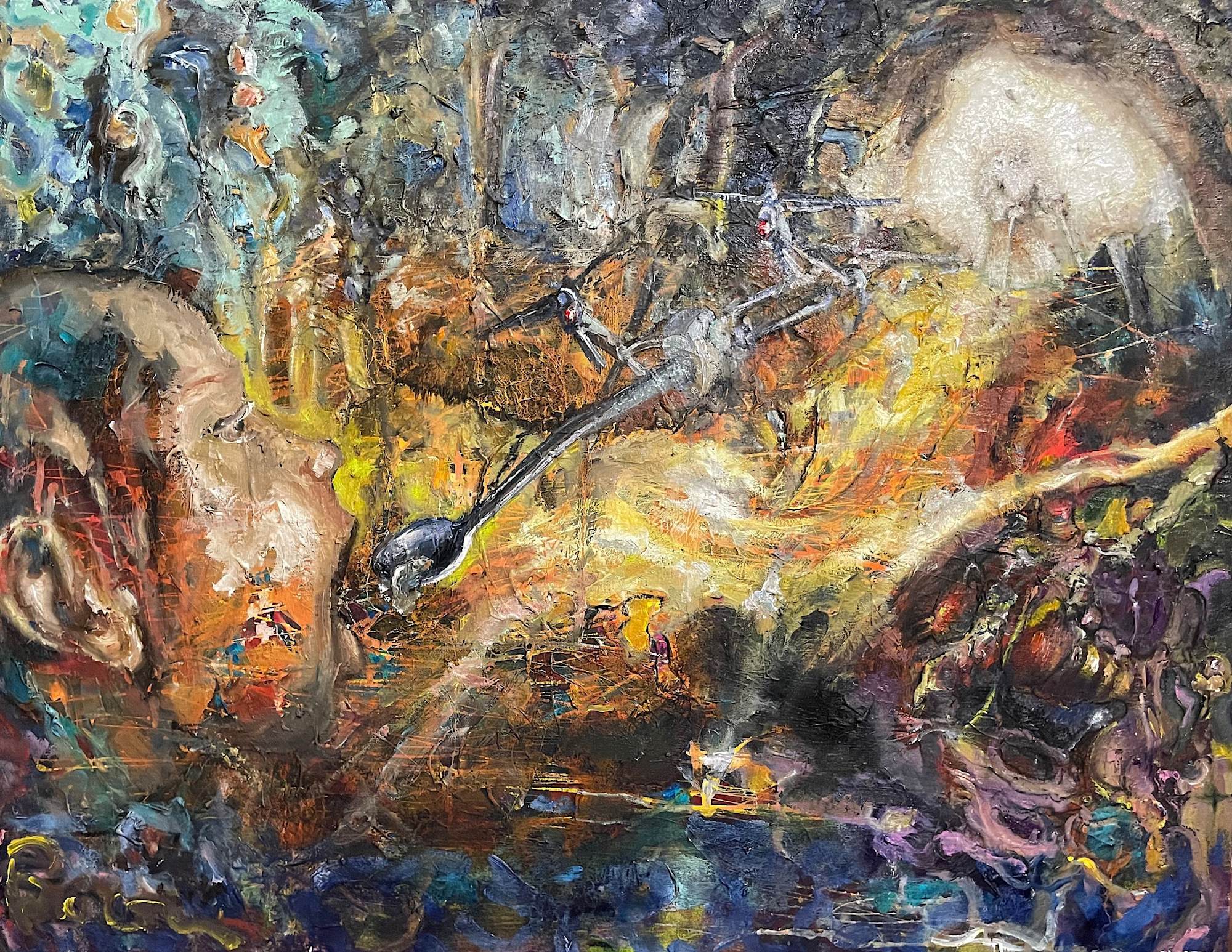 Like the Truman Show movie, this oil painting is a footnote to Plato's Allegory of the Cave. Can this vulnerable human infant transcend her mirky, AI-driven predicament, and eventually learn to think for herself? And what can we say about that fragile old man, seemingly at the end of his life, at the opening of the cave where the light gets in?