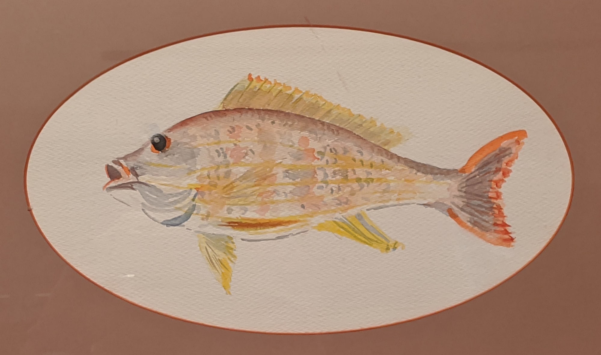 Yellow fined fish looking left with yellow stripes.