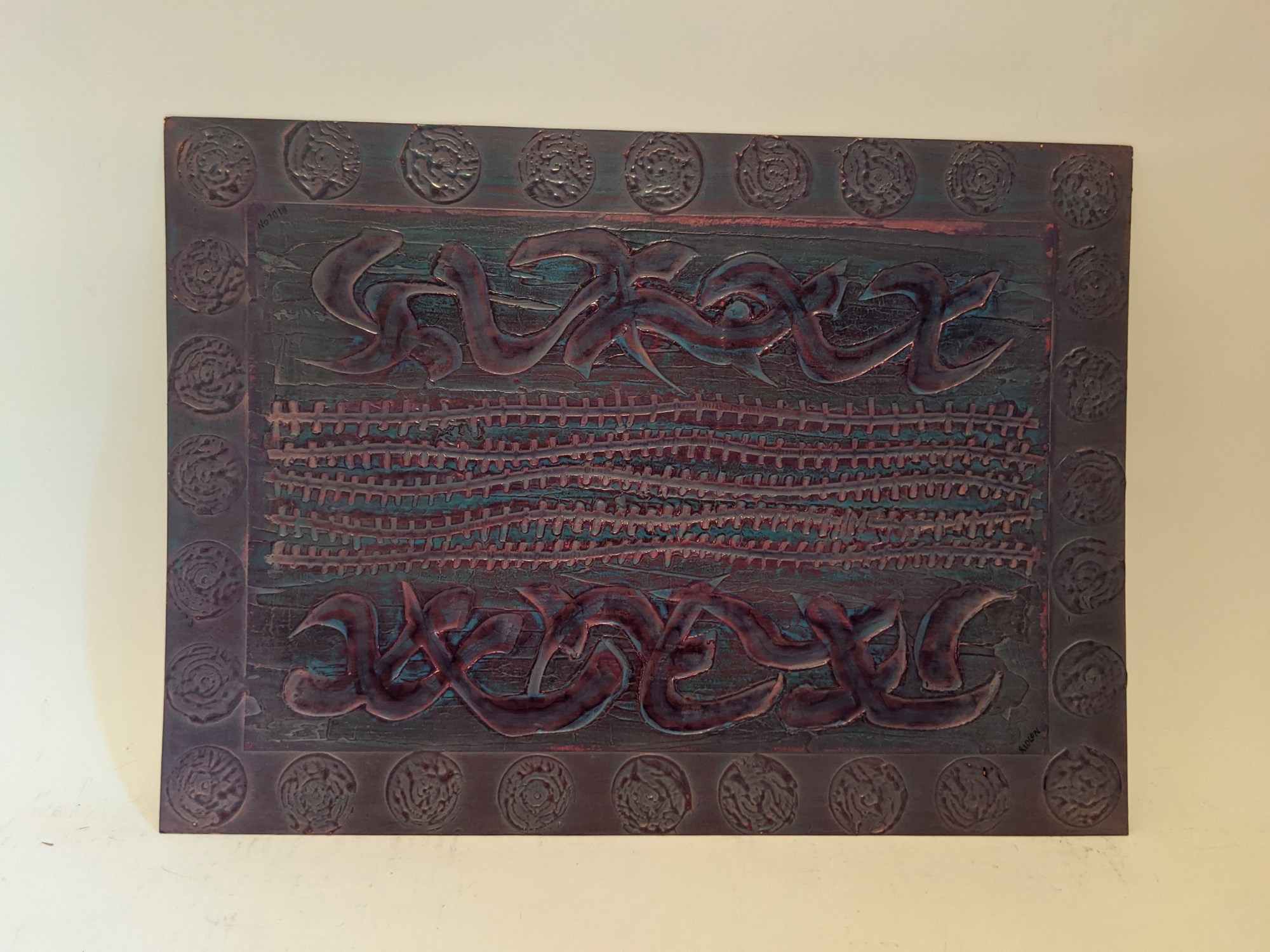 dark background with medallion imprint border, cross hatched curvy lines, and sweeping symbols. Dark purplish hues.