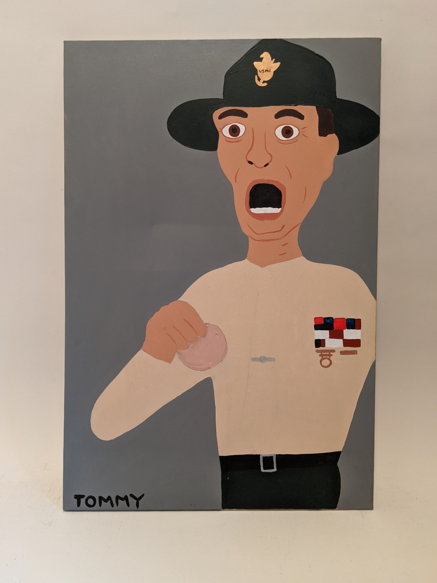 Drill Sargent USMC holding donut. Gray background.