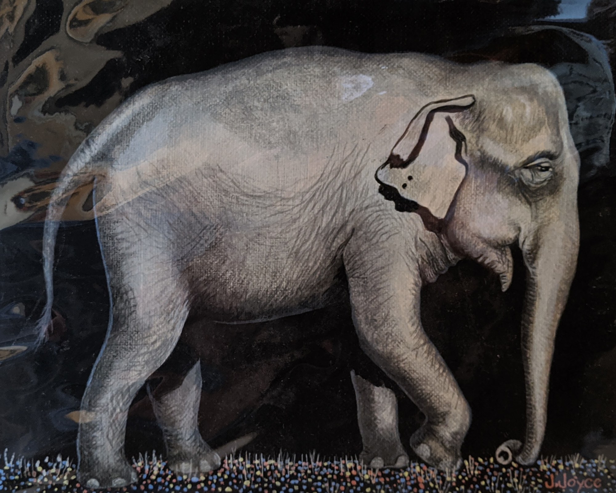Elephant walking right . Black background. Only color on ground - blue, red, yellow dots. Incribed 10/150