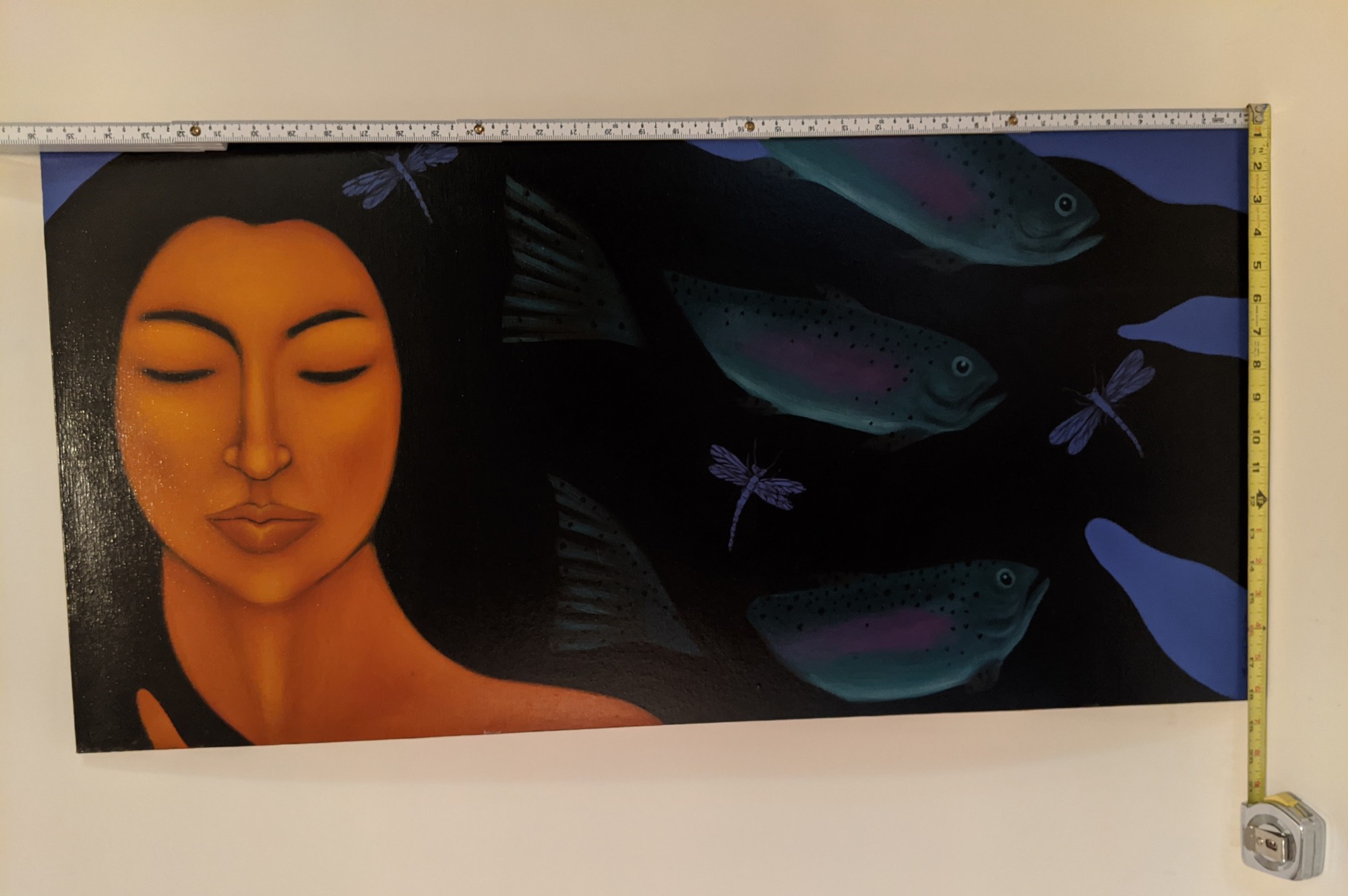 Inpsired by the artist's many camping and trout fishing trips on the Simtustus Reservoir near Pelton Dam and the Deschutes River in Madras, Oregon. Salmon goddess, woman on left, three salmon/dragonflies.