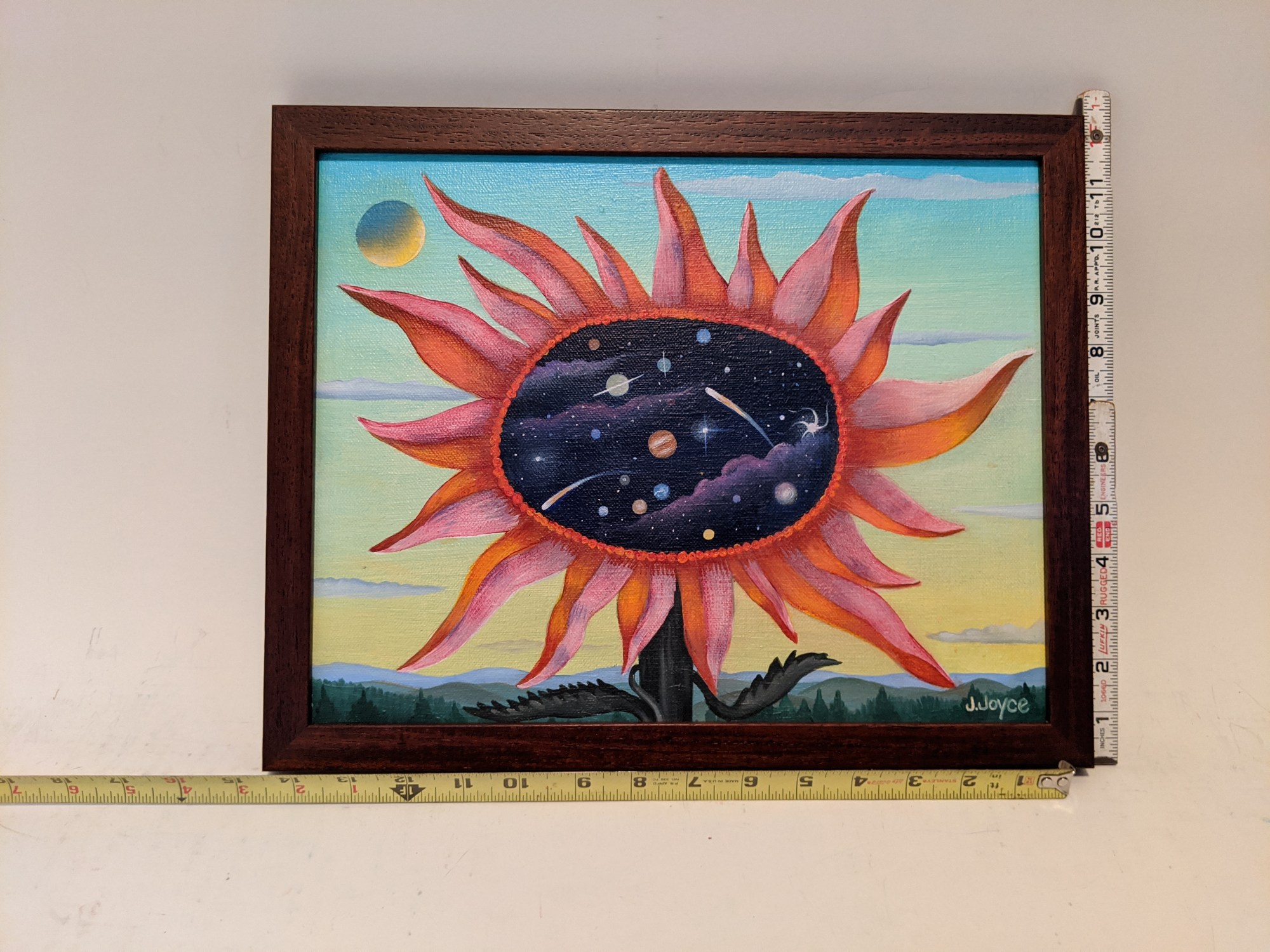 Red sunflower with cosmos in center and yelowish/green/blue sky background.
