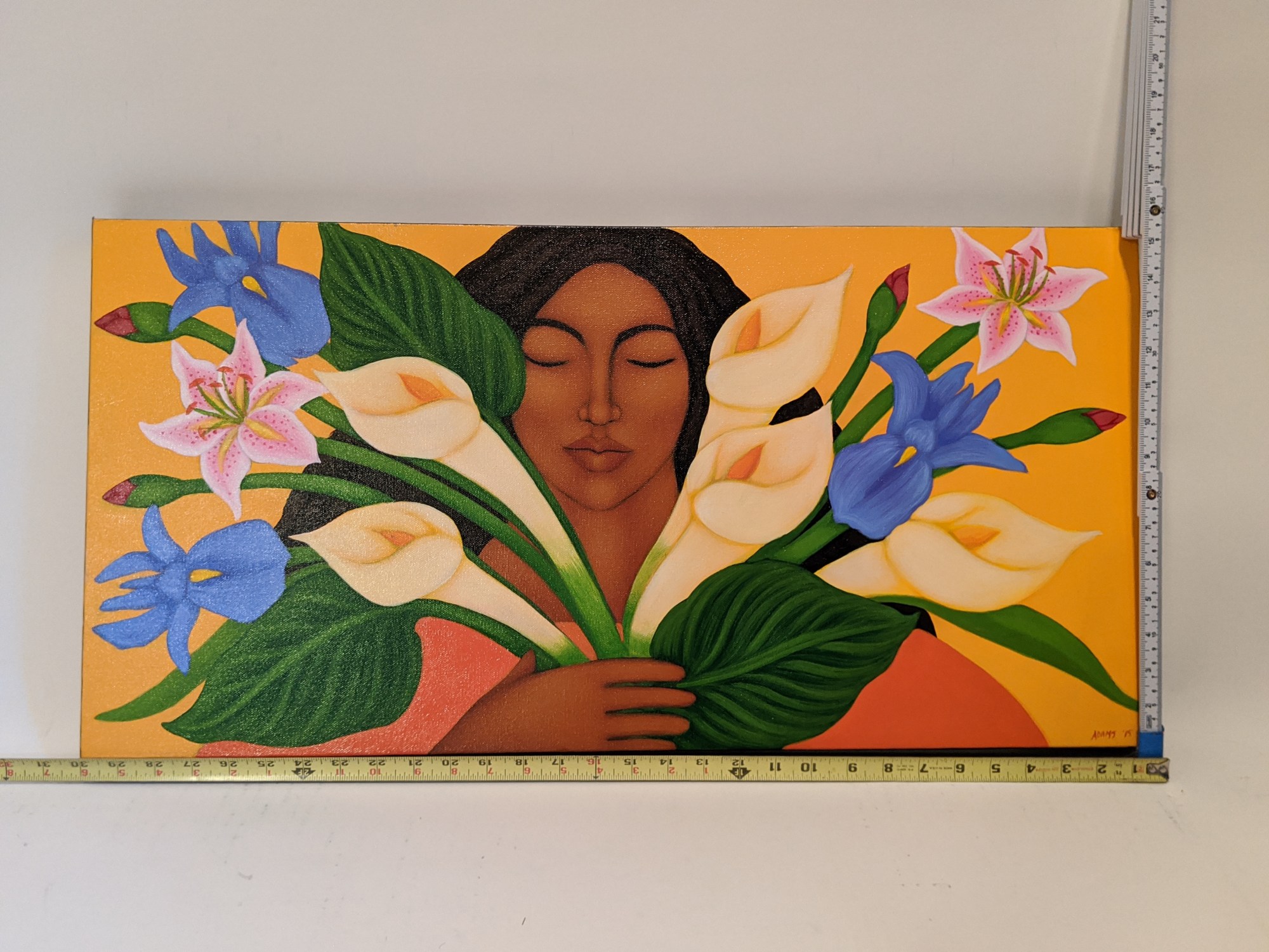 Inspired by travels to Mexico, Diego Rivera, and Mexican folk art (from artist). Lily, orchid, and white flower, woman centered, orange backgorund
