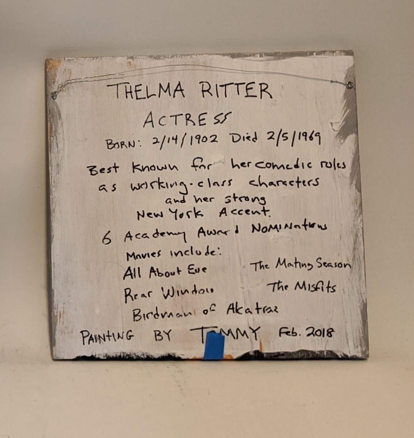 Woman with black hair, white pearl earings/necklace, black dress with blue dots.