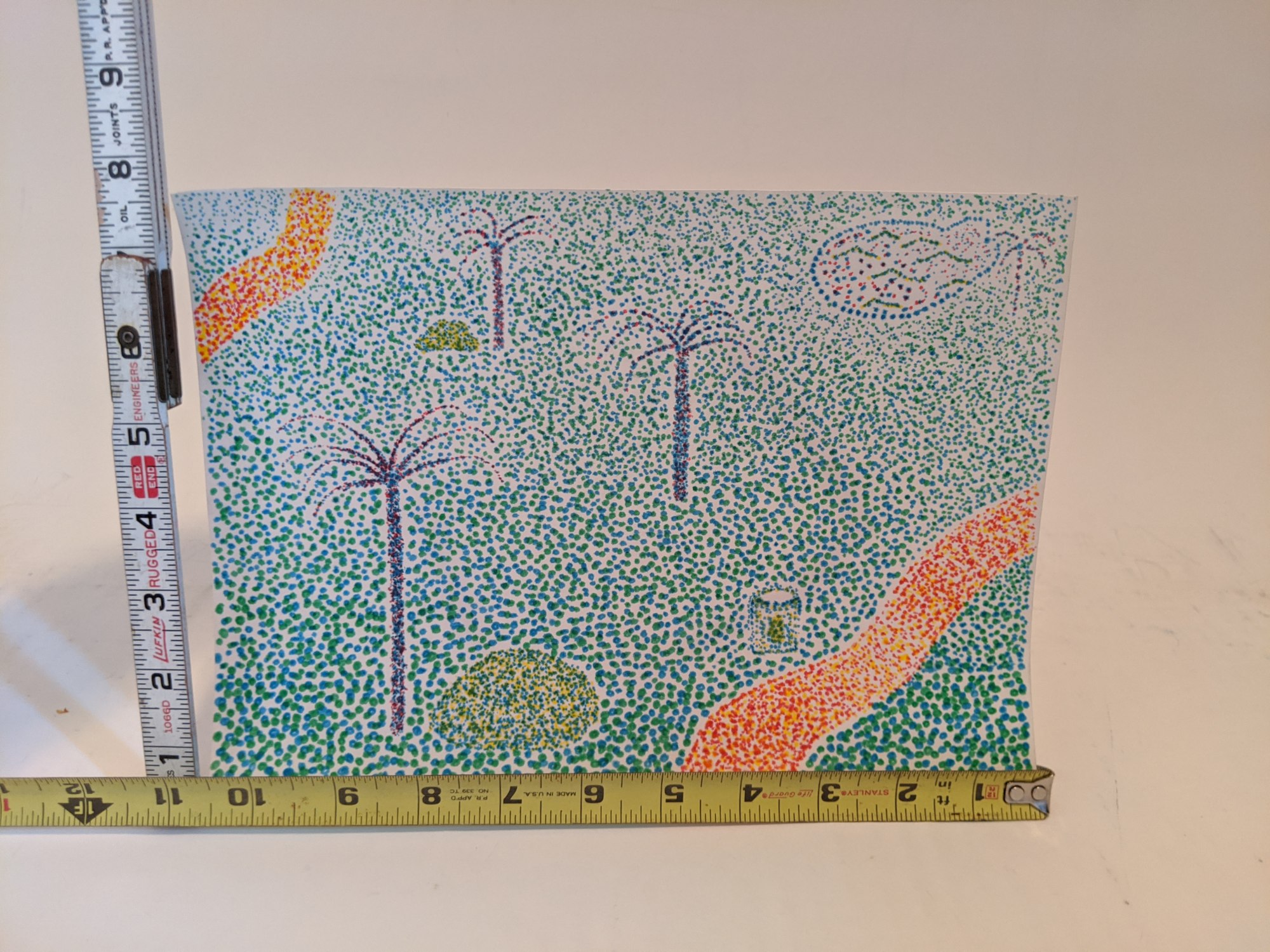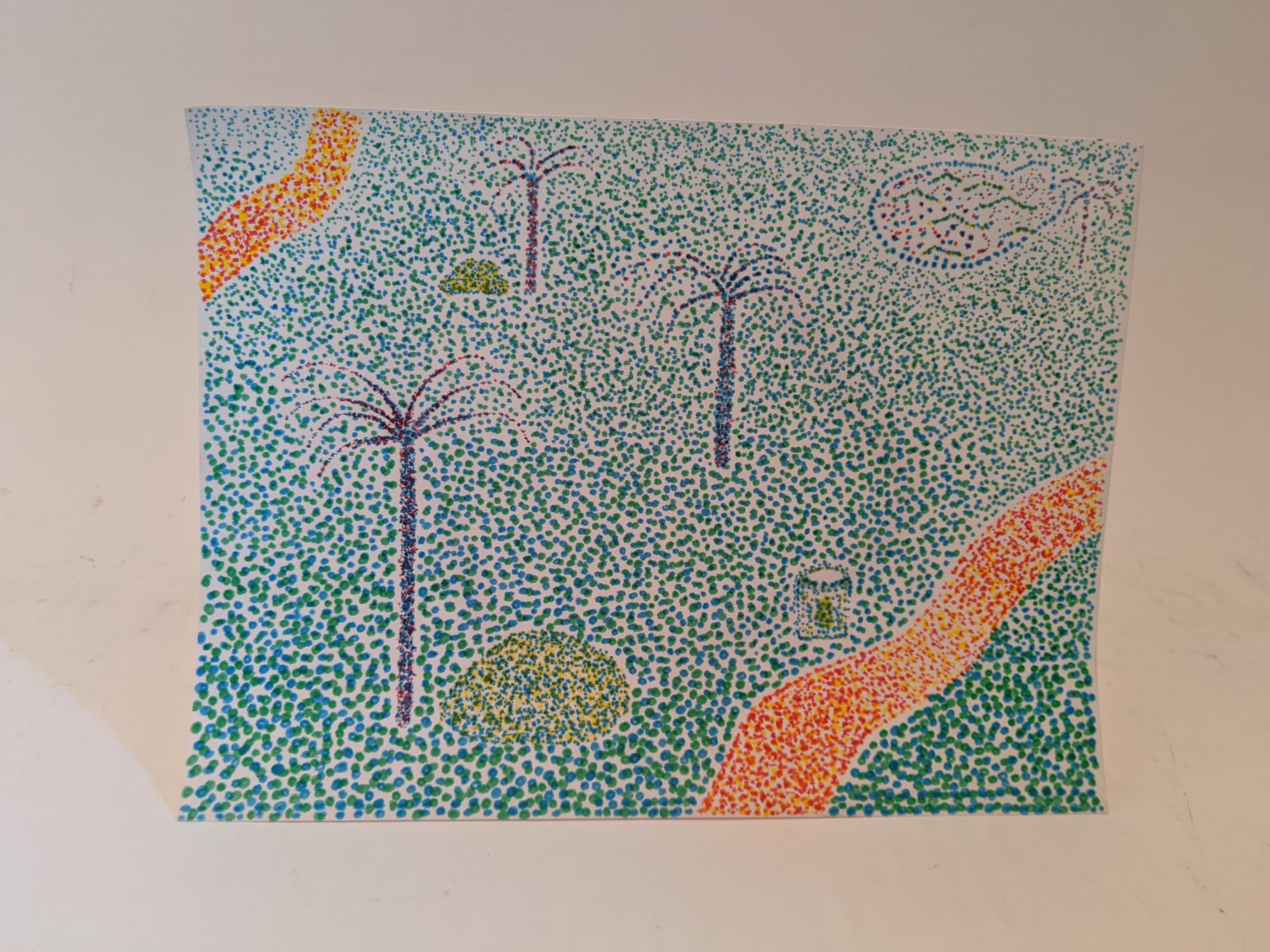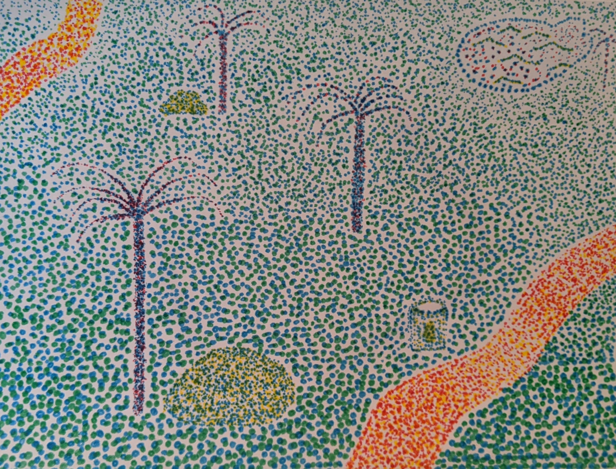 Pointilism exercise. The palm trees, two red paths with blue and green background.
