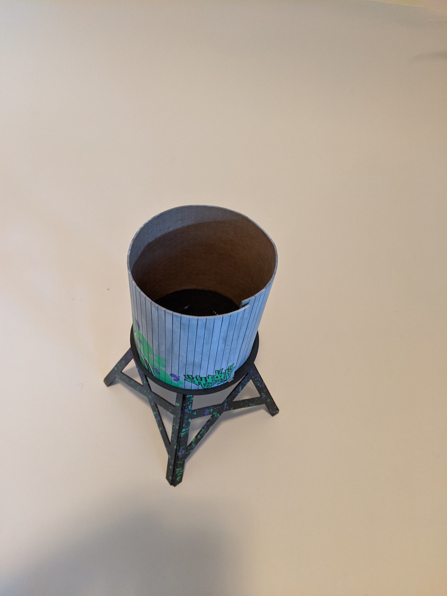 Paper/cardboard watertower. Black roof, blues sides with green/purplee grafitti on four legs.