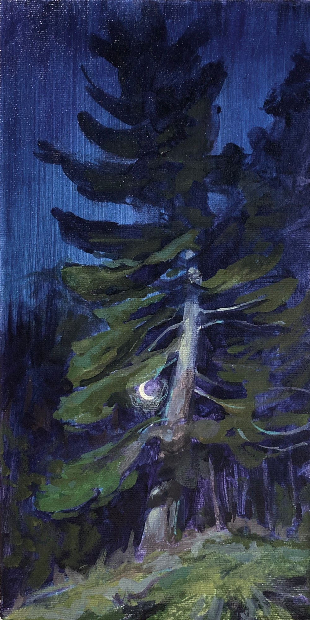 This beautiful pine has a fairly hollow trunk. I know she probably doesn’t have many seasons left so when I saw the crescent moon tucked into her branches I had to paint her portrait.