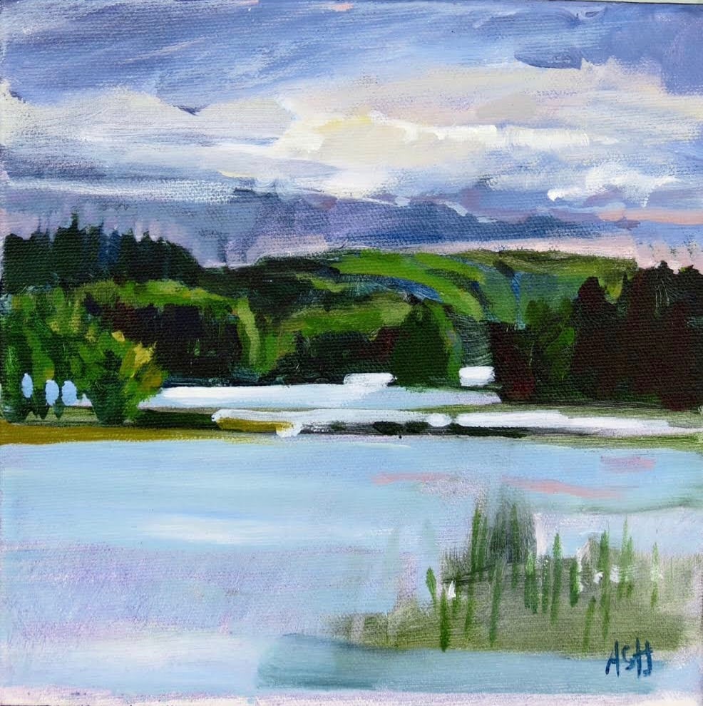 Couchain Lake off Paugh Lake Rd, painted on location in late summer. The last 1/2 hour of sunlight brought an amazing show of glowing greens and silver sparkle on the water.