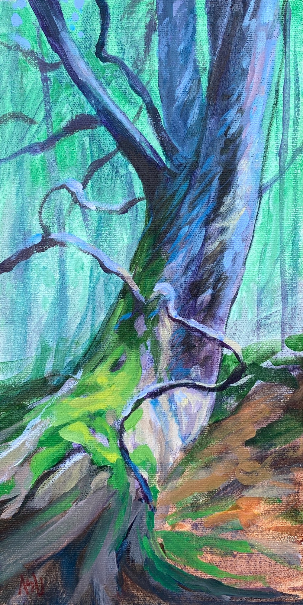 Something caused this tree to lose her grasp on the hillside and she continued to grow as though in a reclined position. She showcases her beautiful mosses that seem to glow following rainfall.