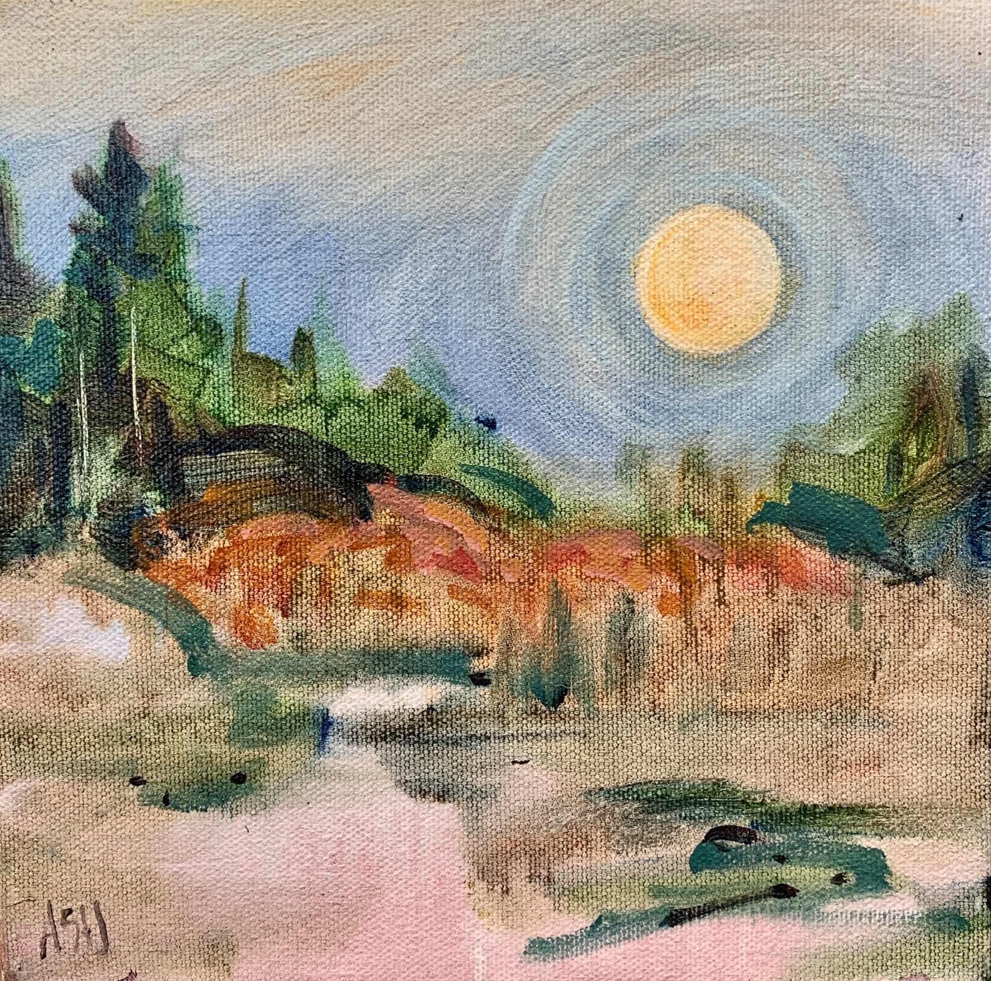 Painted on location, by vehicle headlights. The September Super Moon was rising behind me and my painting companion when I bent down to rinse a brush and caught sight of it. I gasped and my friend immediately thought “Bear!” We packed up our gear and moved across the road to capture this new sight. From down the trail, two hikers emerged looking quite curiously at us painting in the dark. “The moon, the moon!!” We exclaimed. They too had been completely unaware of its presence behind them.