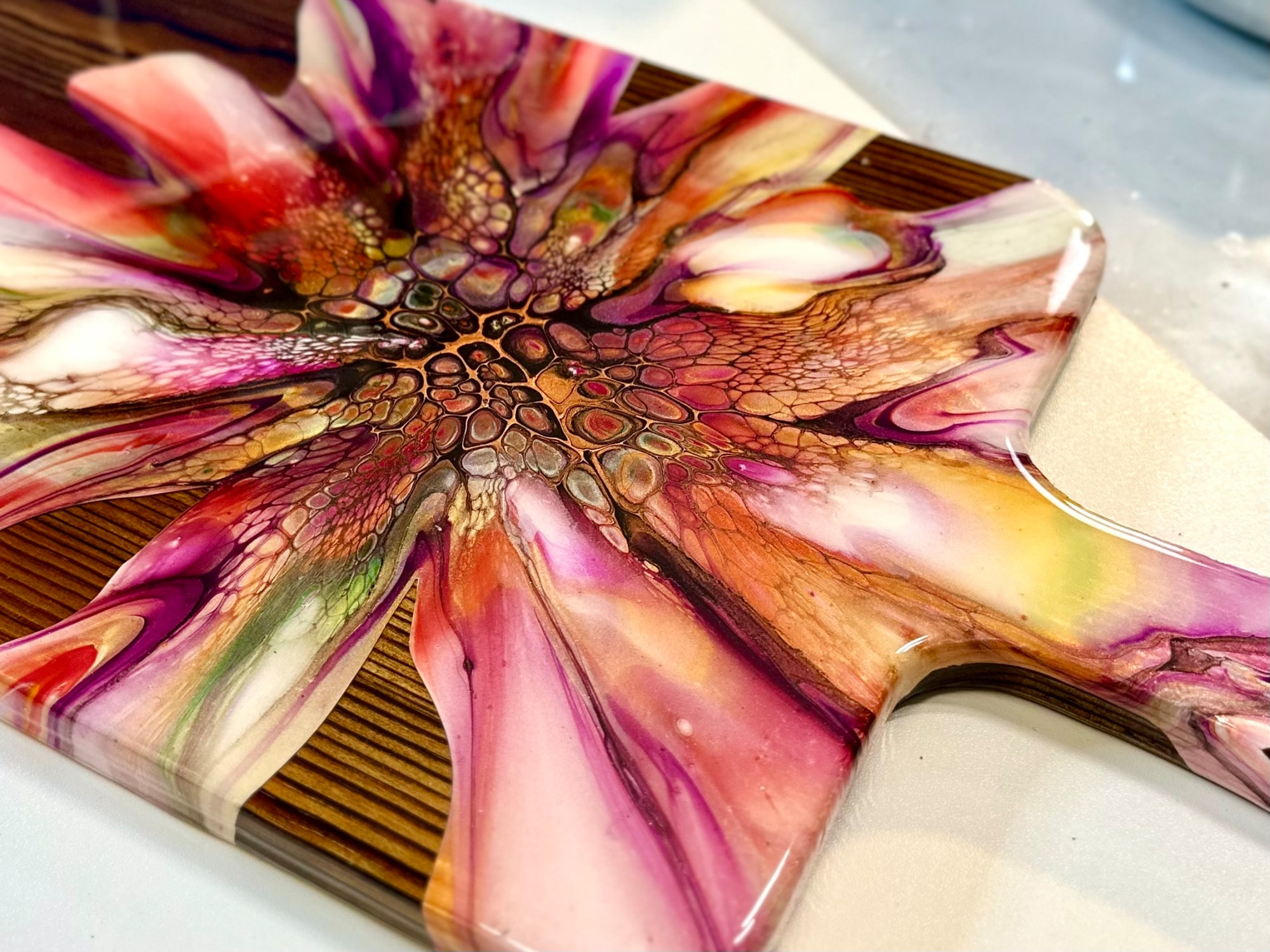 Acrylic Paint, mica pigments, and resin on wood charcuterie board.