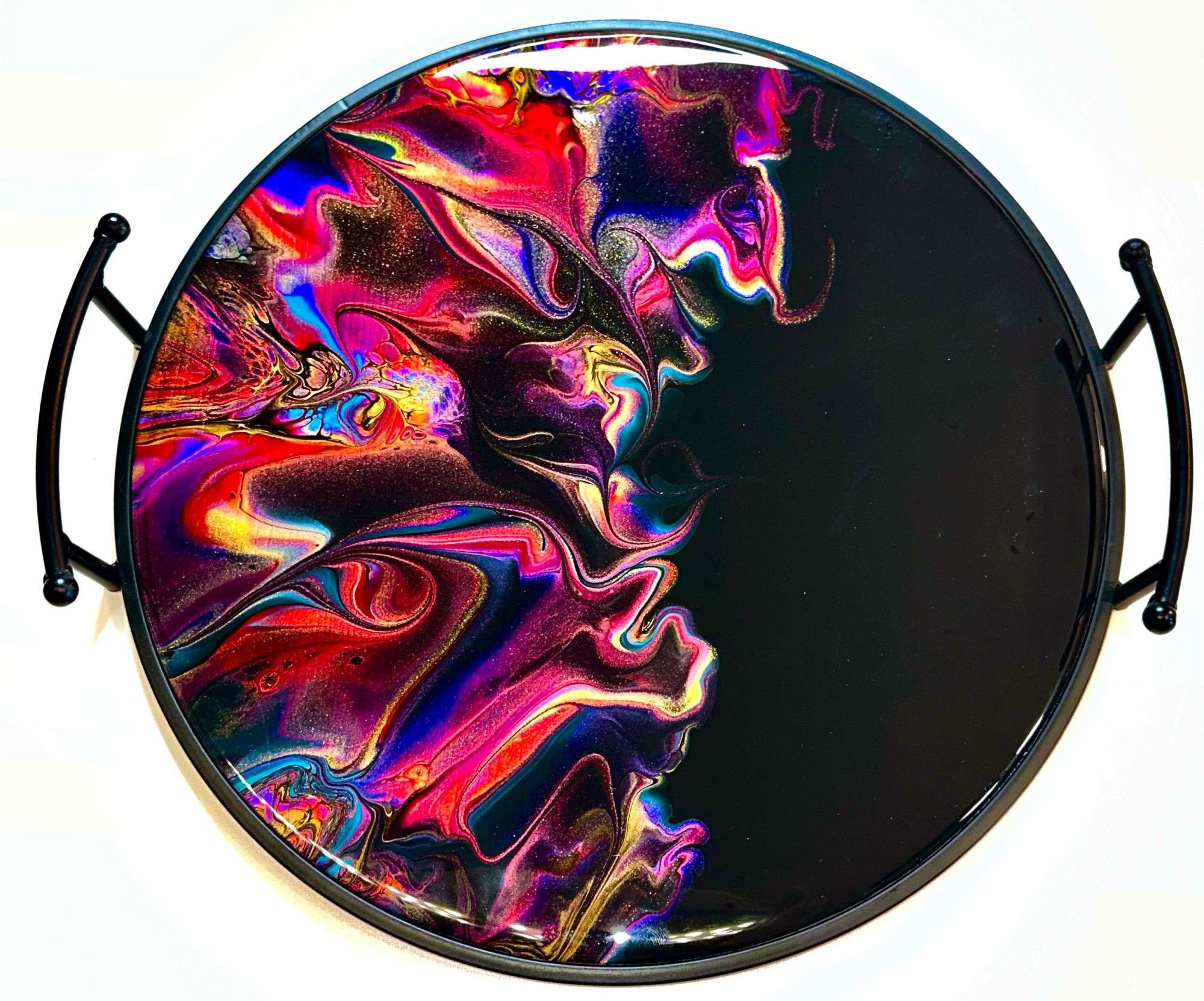 Acrylic Paint, mica pigments, and resin on MDF platter with metal handles.